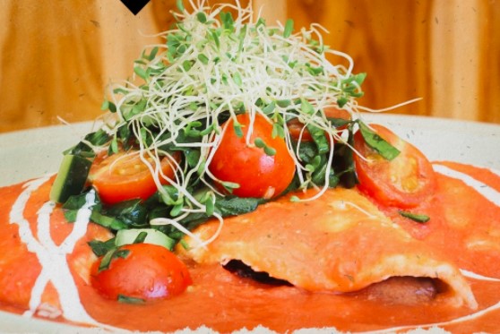 Delicioso cuernito con queso panela y tomate a la parrilla. Acompañado de espinacas, germinado, aguacate y aderezo.