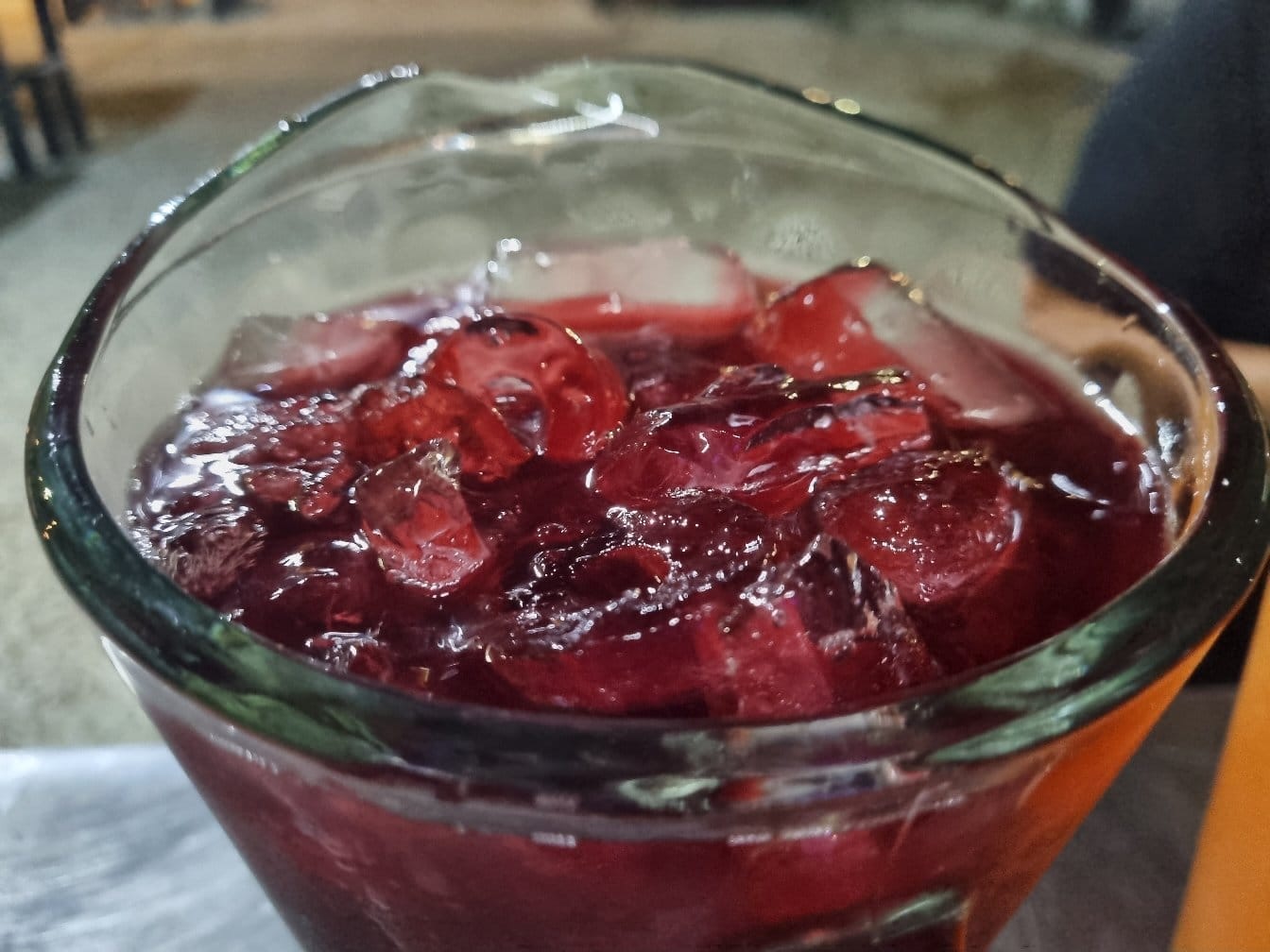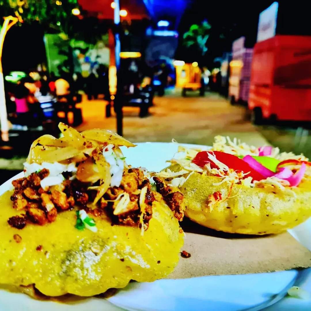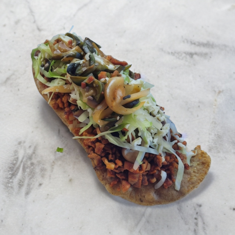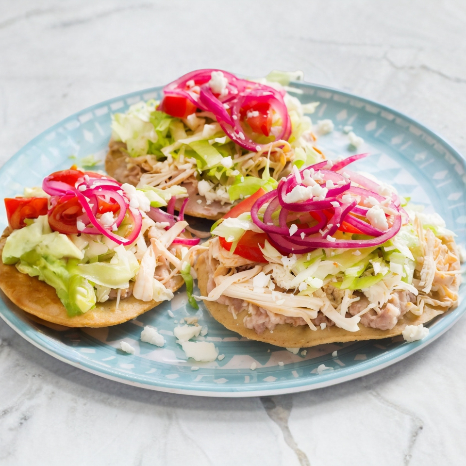 Tortilla frita dura que lleva frijol colado, cebolla, tomate y pollo asado o carne asada.
