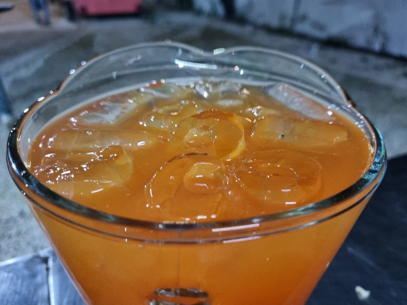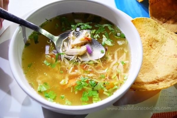 Caldo de pollo, acompañado de chile habanero, cilantro, cebolla y tostadas.