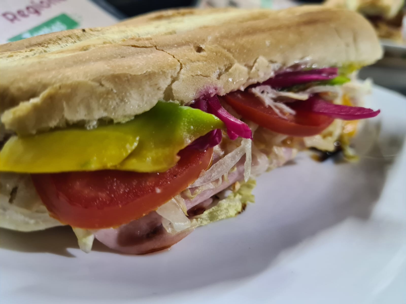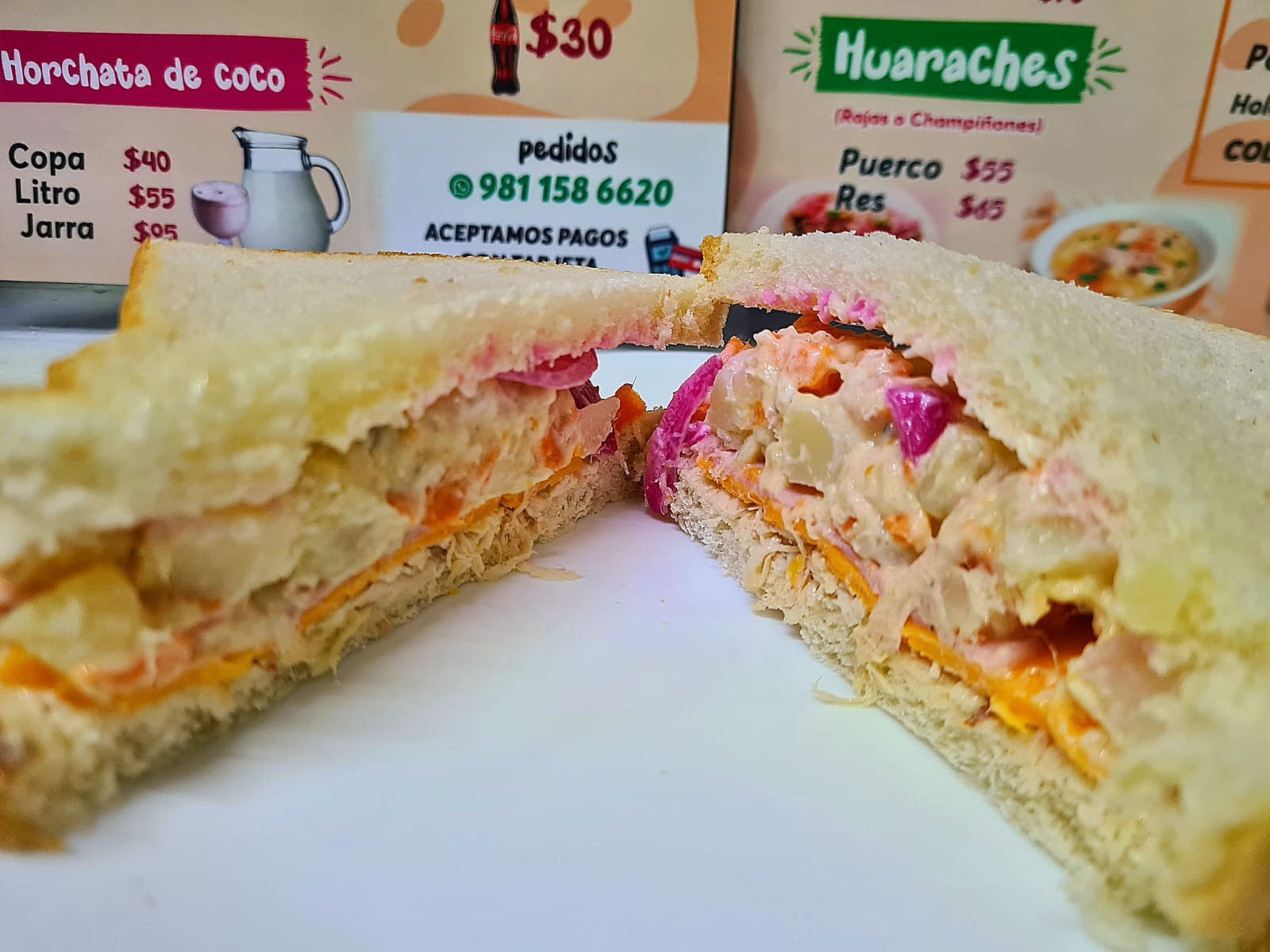 Sándwich de pan blanco de 1 piso con ensalada de pollo, jamón, queso, cebolla roja y pollo asado.