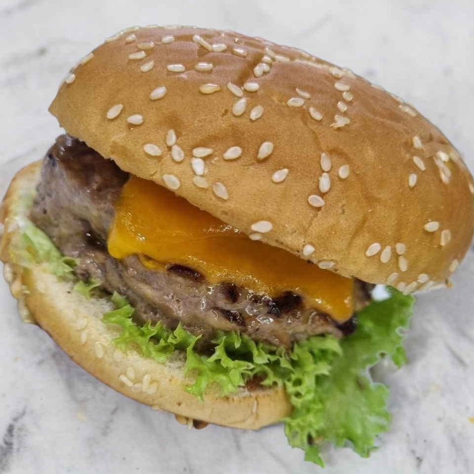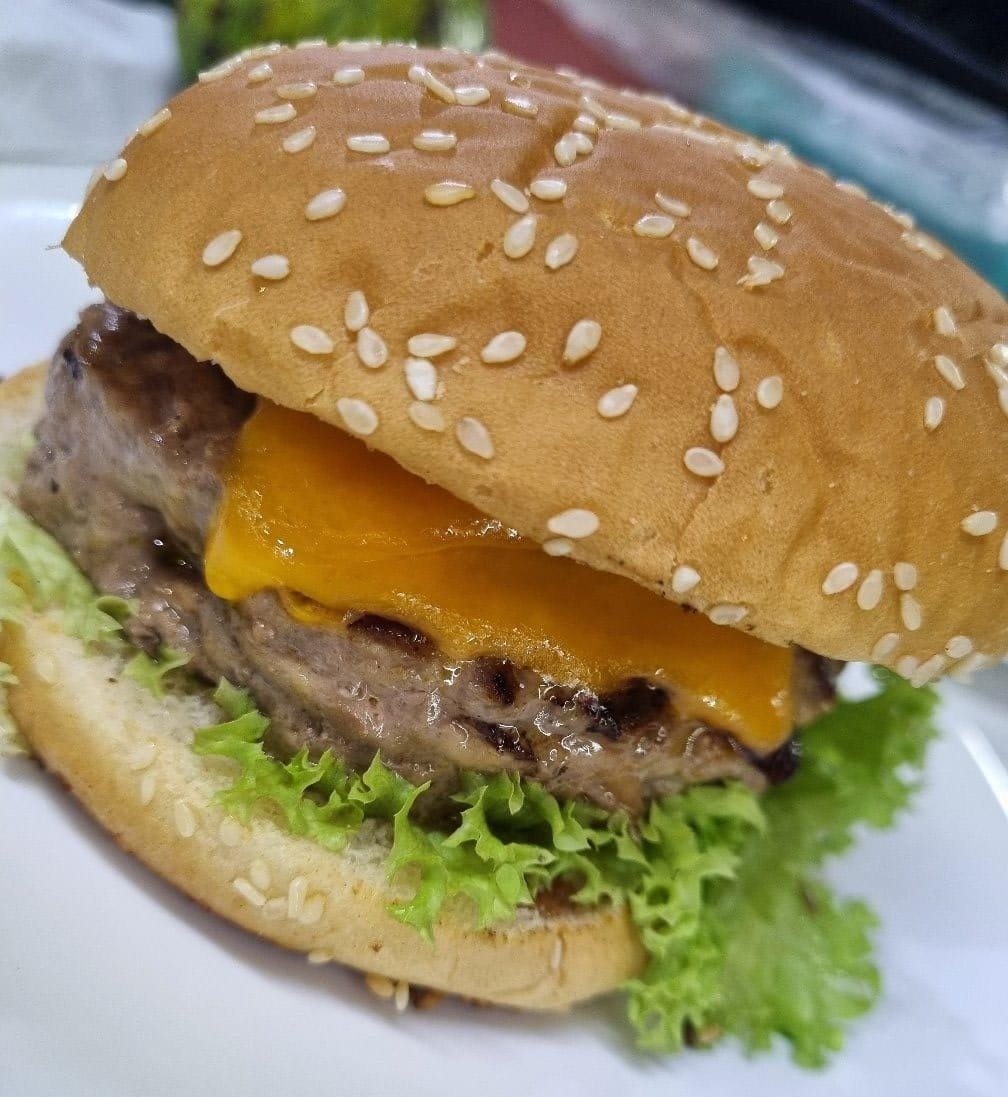 Hamburguesa de carne de res casera, con tomate, cebolla, mayonesa, cátsup, jamón, y queso deysi derretido.