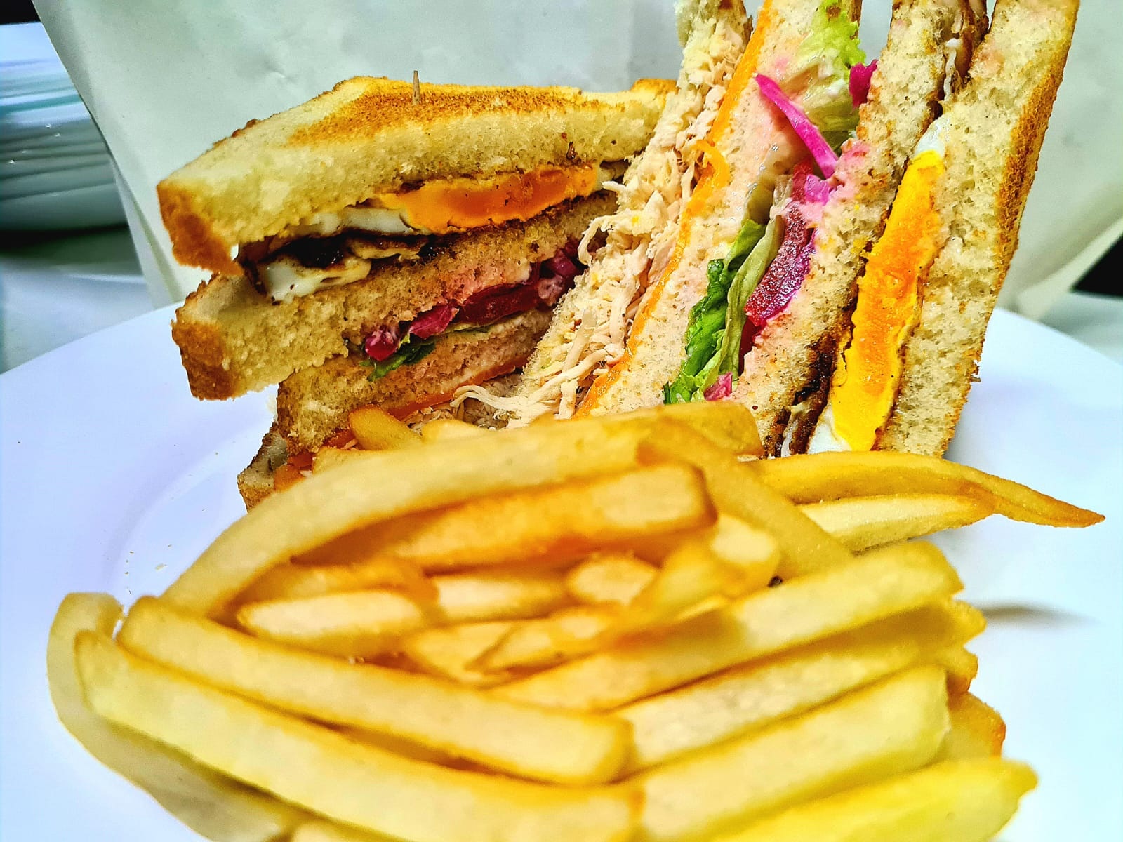 Sándwich de pan blanco de 3 pisos con huevo, pollo, jamón, queso y vegetales.