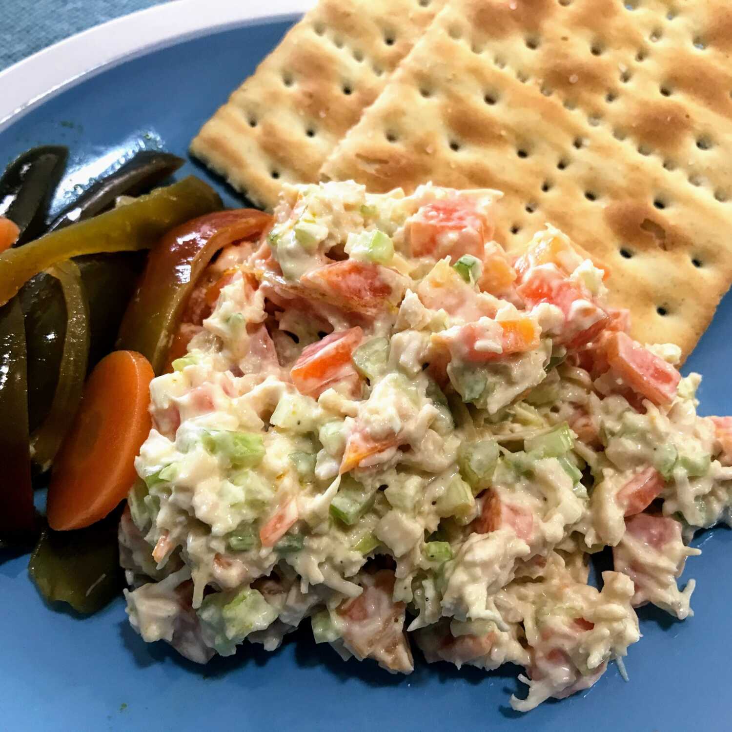 Ensalada de verduras que contiene pollo, papa, zanahoria, chícharo, mayonesa.