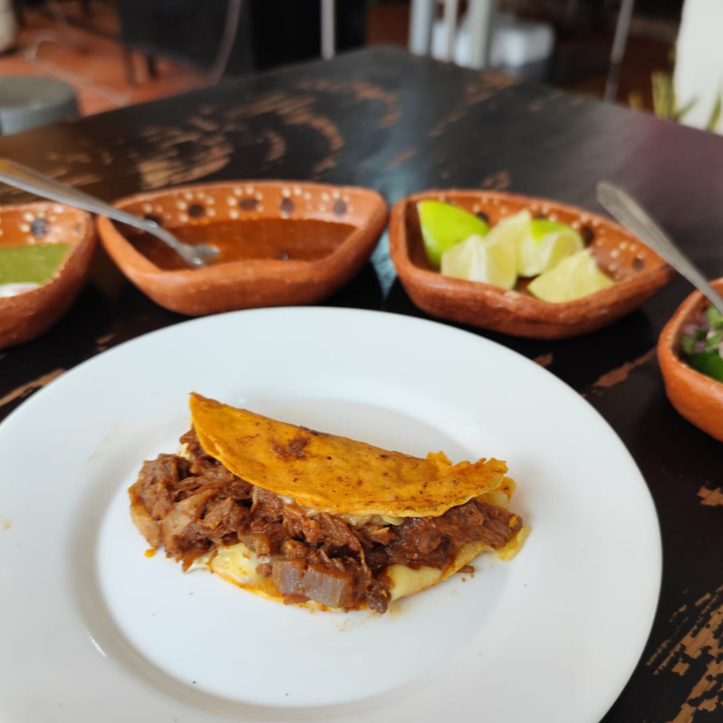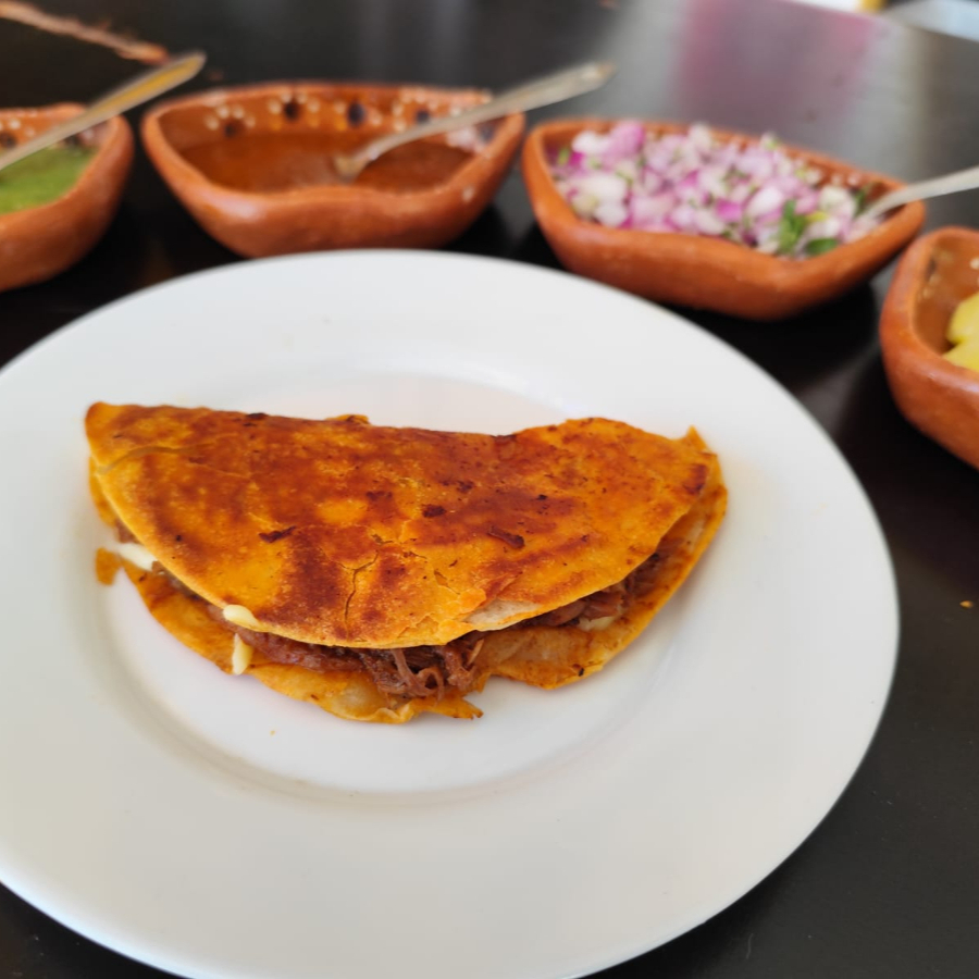Tortilla de maíz recién hecha, dorada lentamente en consomé de birria elaborado con carne de res cocida a fuego lento, jitomate, cebolla blanca, ajo, laurel, comino, clavo y chiles secos; rellena con carne suave y jugosa, queso manchego derretido, acompañada de consomé caliente, cebolla blanca finamente picada, cilantro fresco y limón.