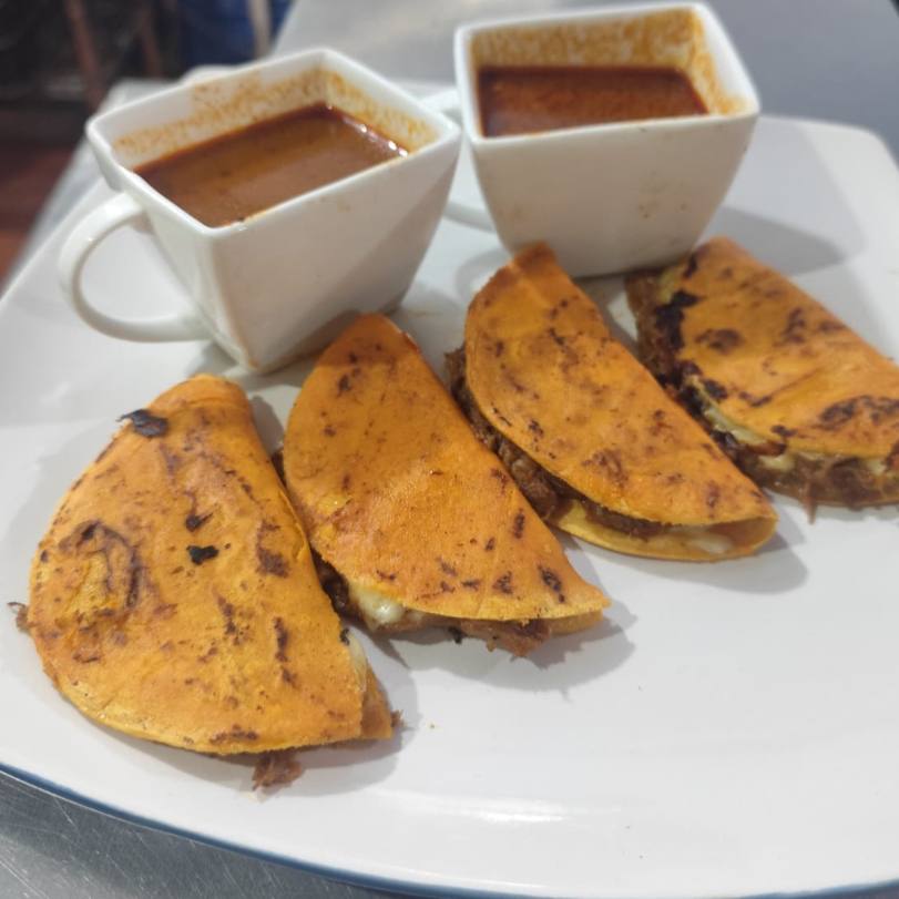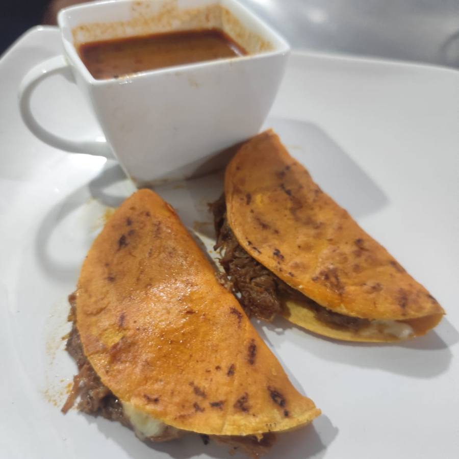 Doble tortilla de harina rellena de carne de res cocida en consomé de birria con jitomate, cebolla, ajo y chiles secos, con queso manchego derretido, dorada hasta quedar crujiente por fuera y suave por dentro.
