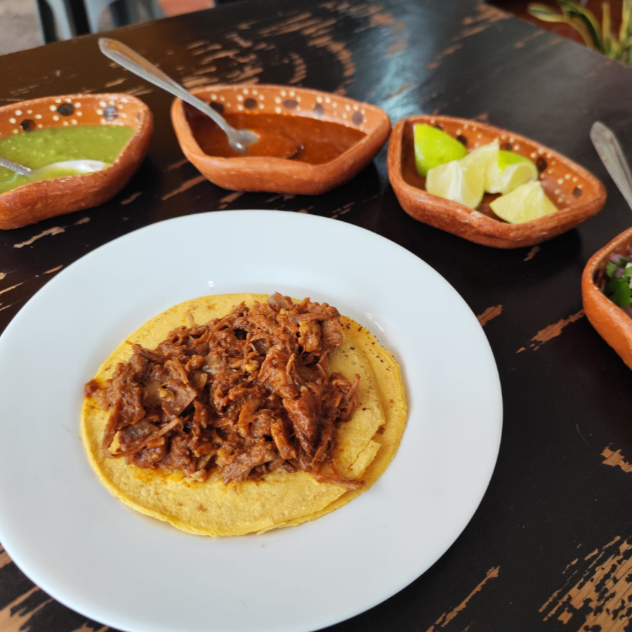 Tortilla de maíz suave rellena de carne de res cocida lentamente en caldo de birria con jitomate, cebolla, ajo, chiles secos y especias tradicionales; se acompaña con cebolla blanca picada, cilantro fresco, limón y salsa casera.
