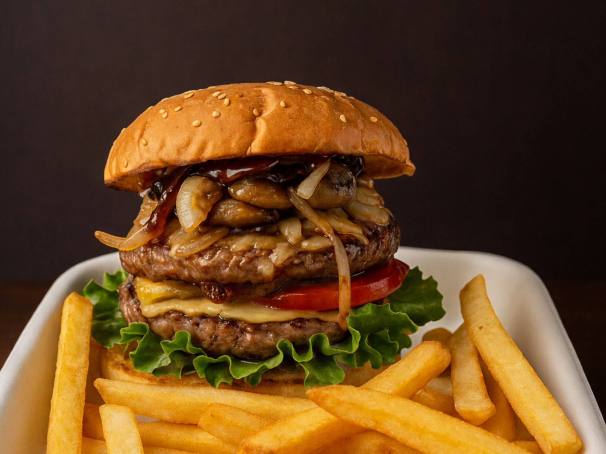 Pan artesanal, deliciosa carne de res champiñones con queso gratinado ala plancha cebolla caramelizada , lechuga ,salsa BBQ y aderezo de la casa