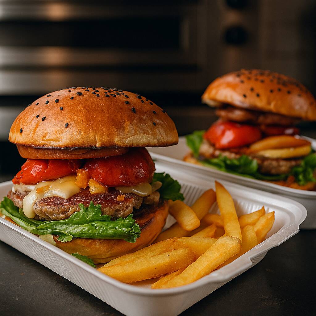 Pan artesanal deliciosa carne de res con queso gratinado, cebolla caramelizada ,jitomate ,lechuga y pepinillos.
