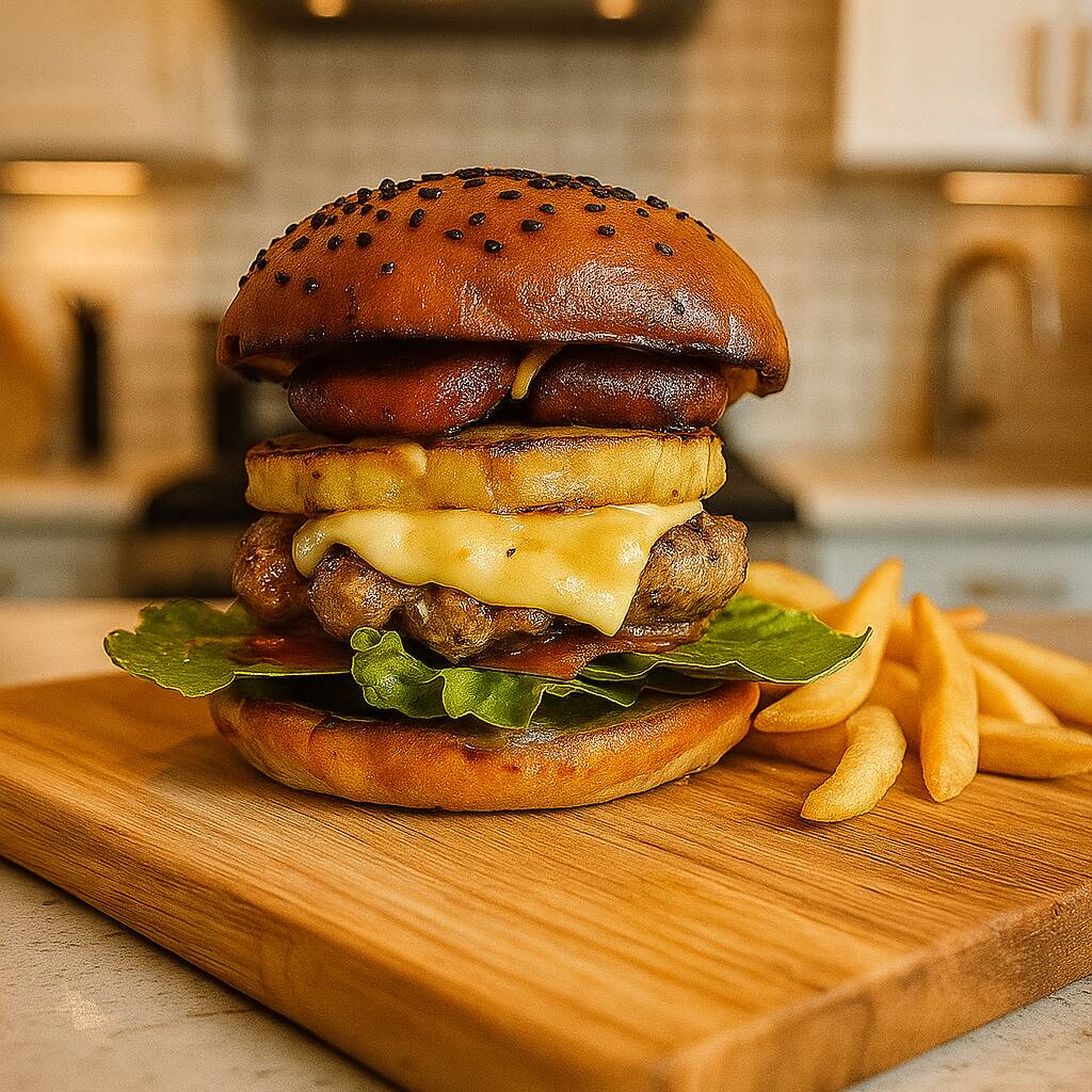 Pan artesanal doble carne doble queso, piña asada y sazonada , chorizo argentino, salchicha parrillera cebolla caramelizada lechuga, salsa BBQ y aderezos.