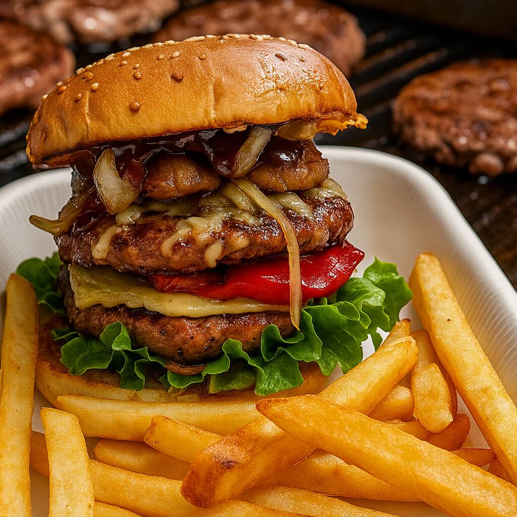 Pan artesanal doble carne de res, doble queso gratinado, chorizo argentino, salchicha parrillera cebolla caramelizada lechuga, salsa BBQ y aderezos.