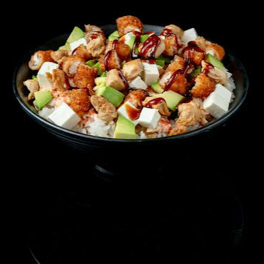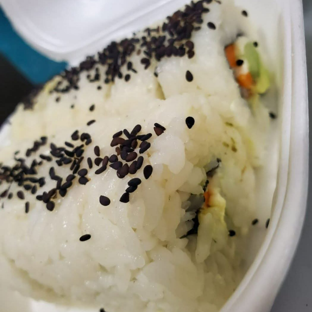 Arroz al vapor acompañado de proteina de pollo, queso crema, aguacate y ajonjoli.