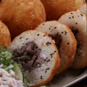 Bola de arroz empanizada rellena de queso crema y arrachera.