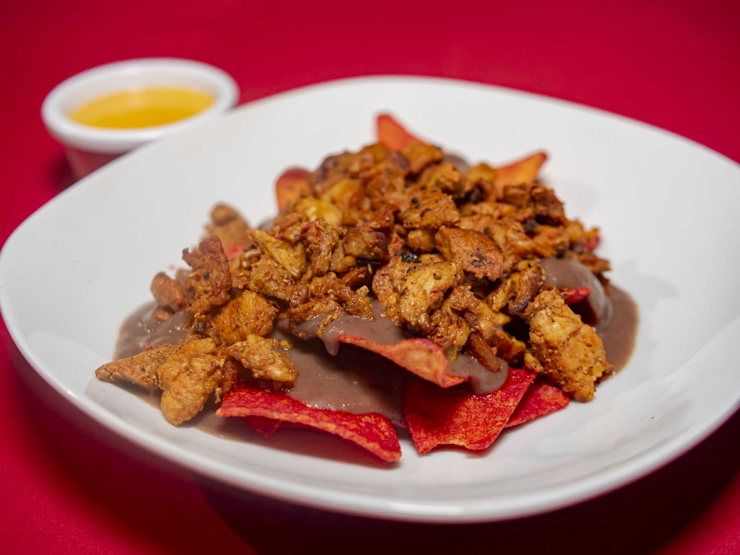 200 gr de tostada, bañados de frijol con carne de CHULETA, y encima queso de Nacho, acompañado con salsa roja, salsa verde, salsa piñaneto.
