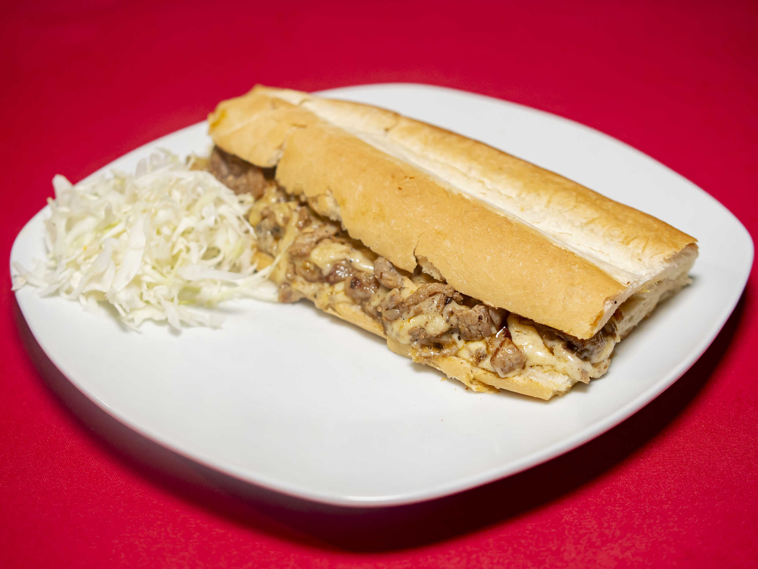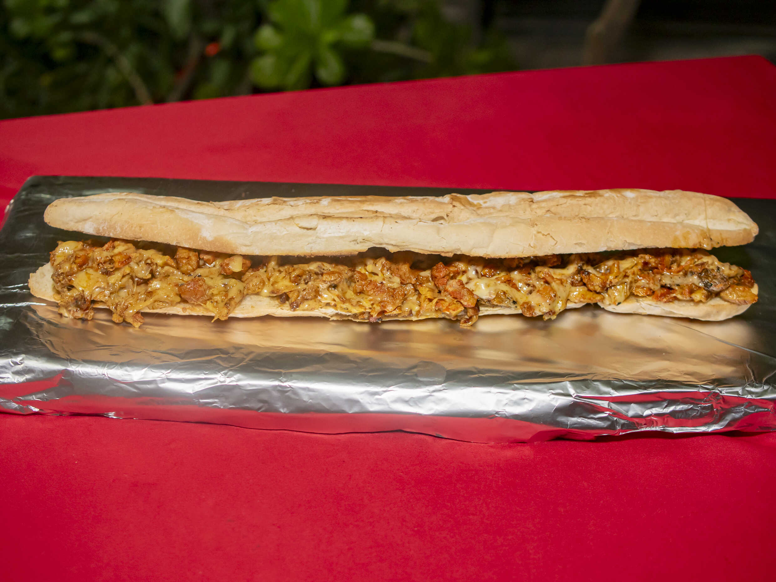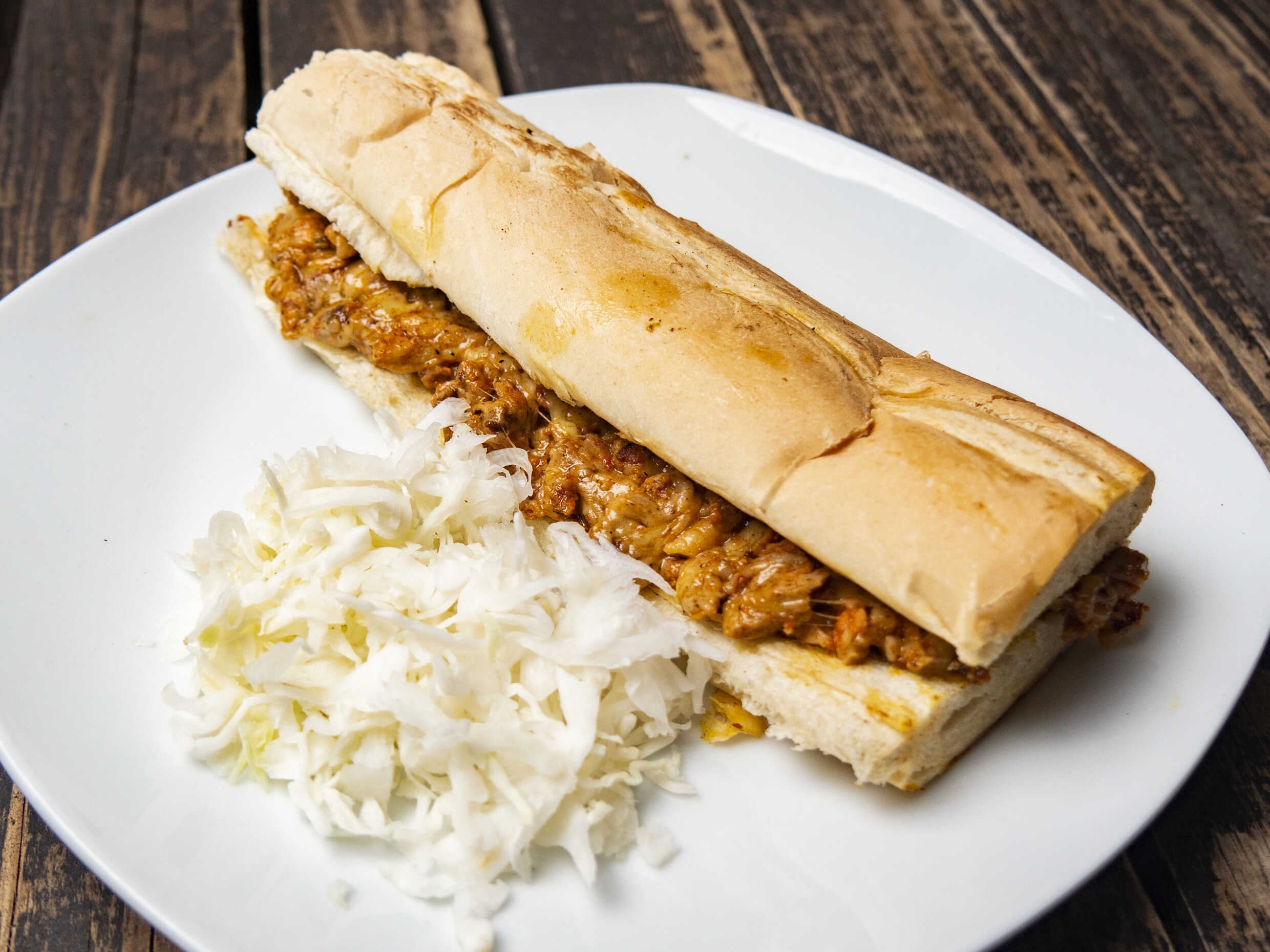 Una barra de pan de 50 cm, con carne de chuleta, con repollo, acompañado de salsa verde, salsa roja, salsa piñaneto