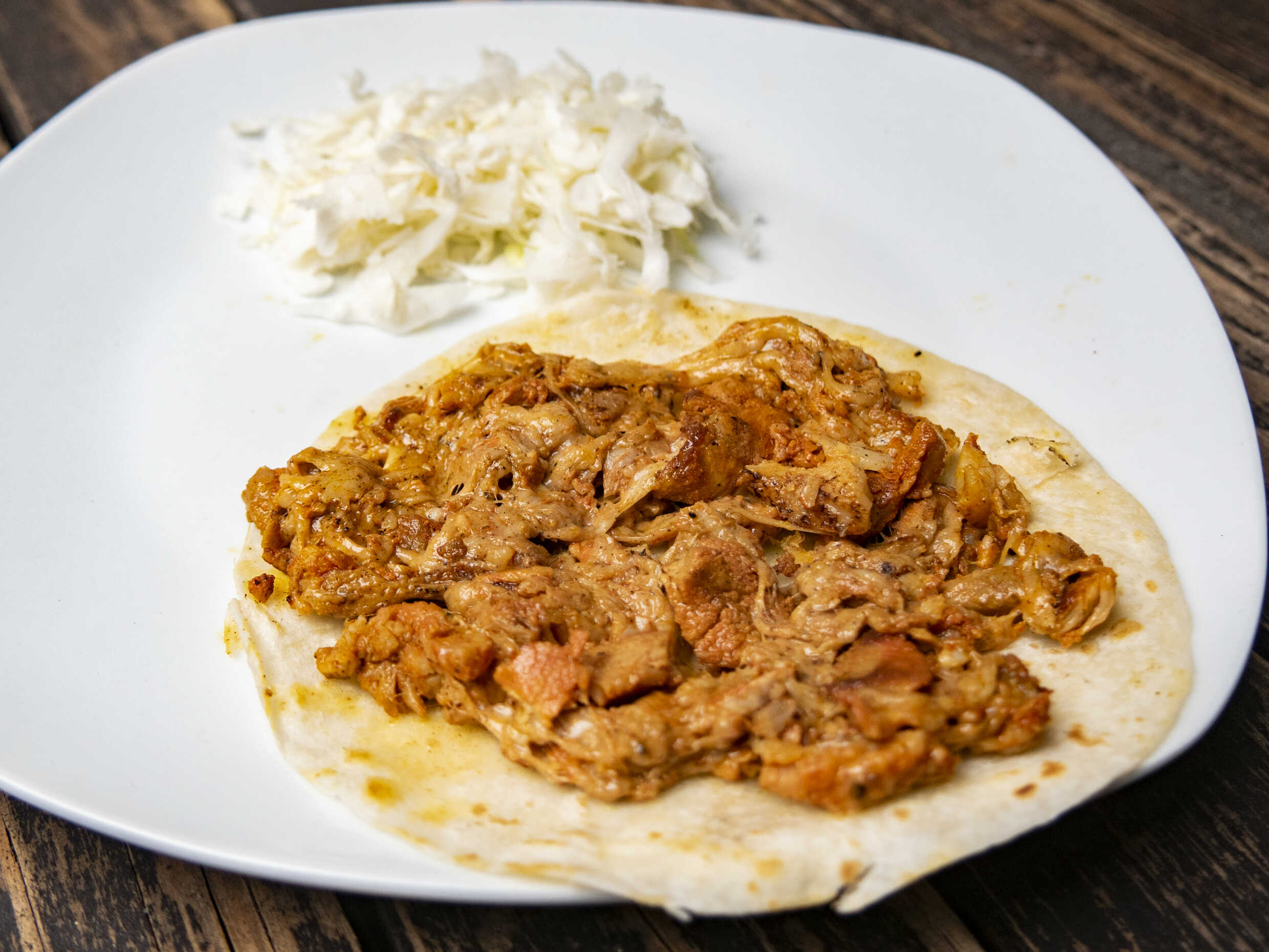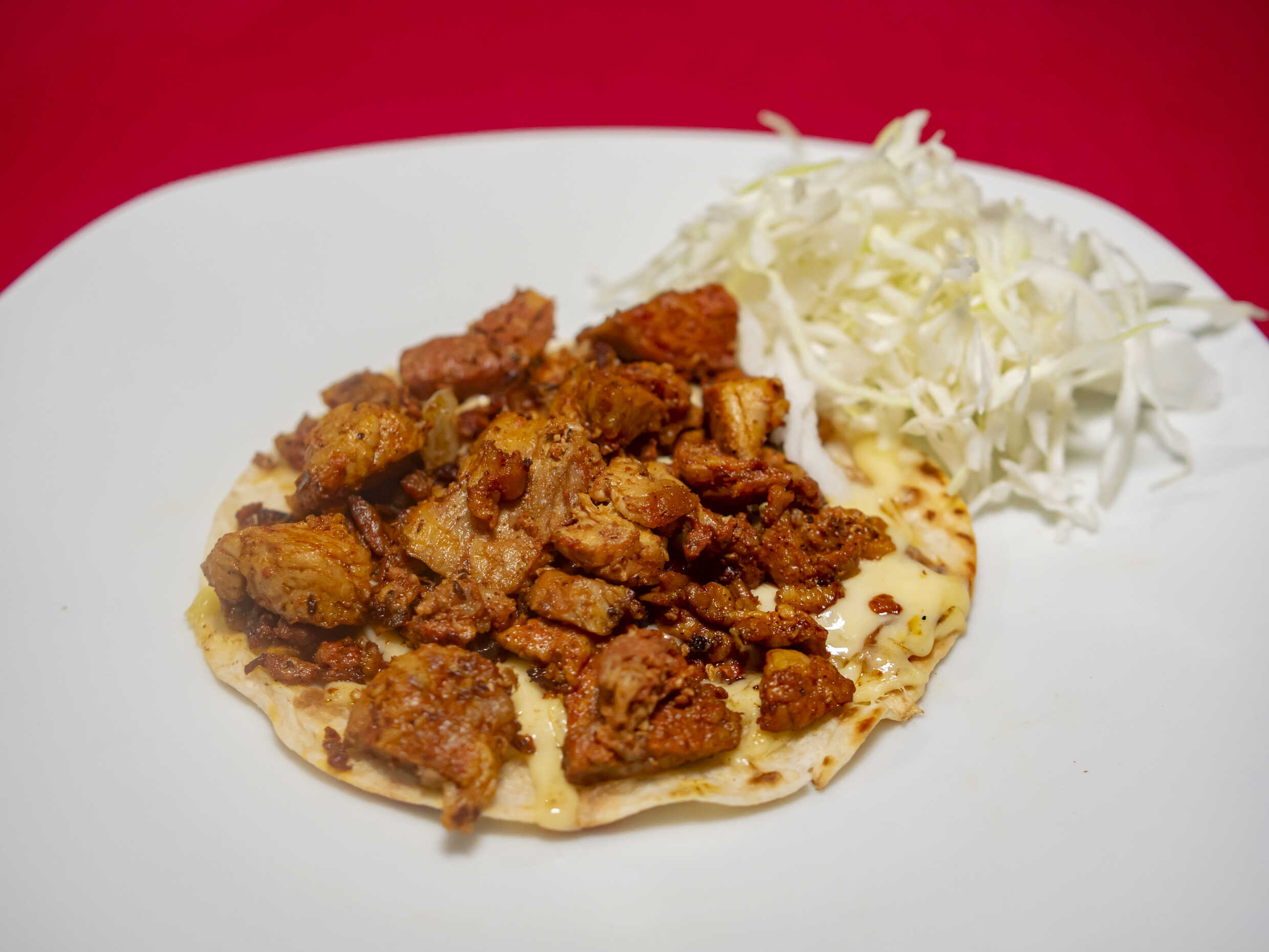 Tortilla de harina normal , con carne de pastor mezclado con queso manchego, con repollo