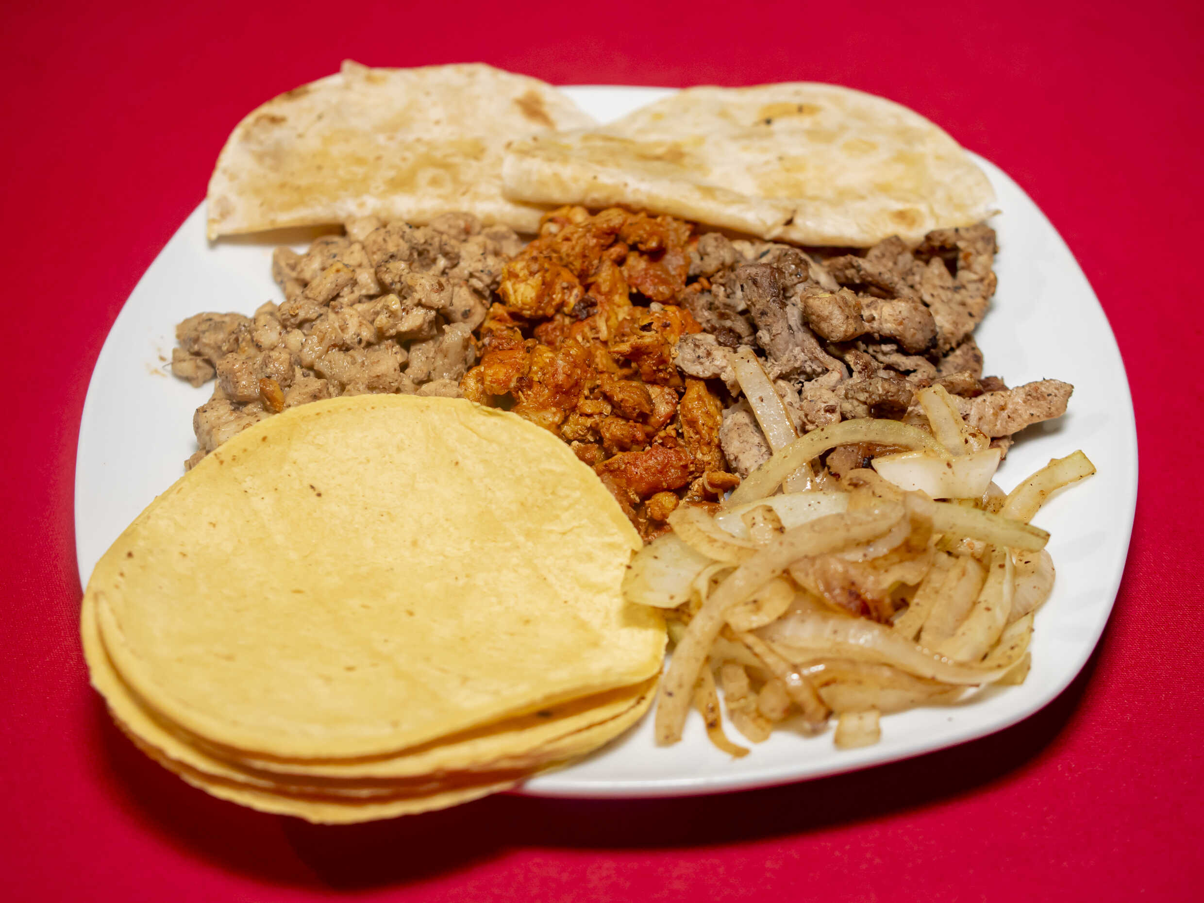 250 gr de carne de pastor, carne de chuleta y carne de res, acompañado de salsa verde, salsa roja, salsa piñaneto,repollo, 8 pzas de tortilla de maíz ( puede ser mixto harina y maíz) y 2 quesadillas y un poco de cebolla frita