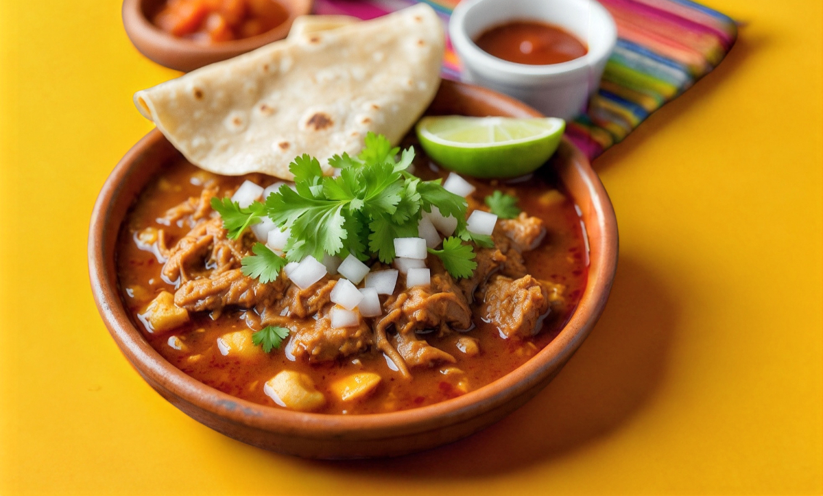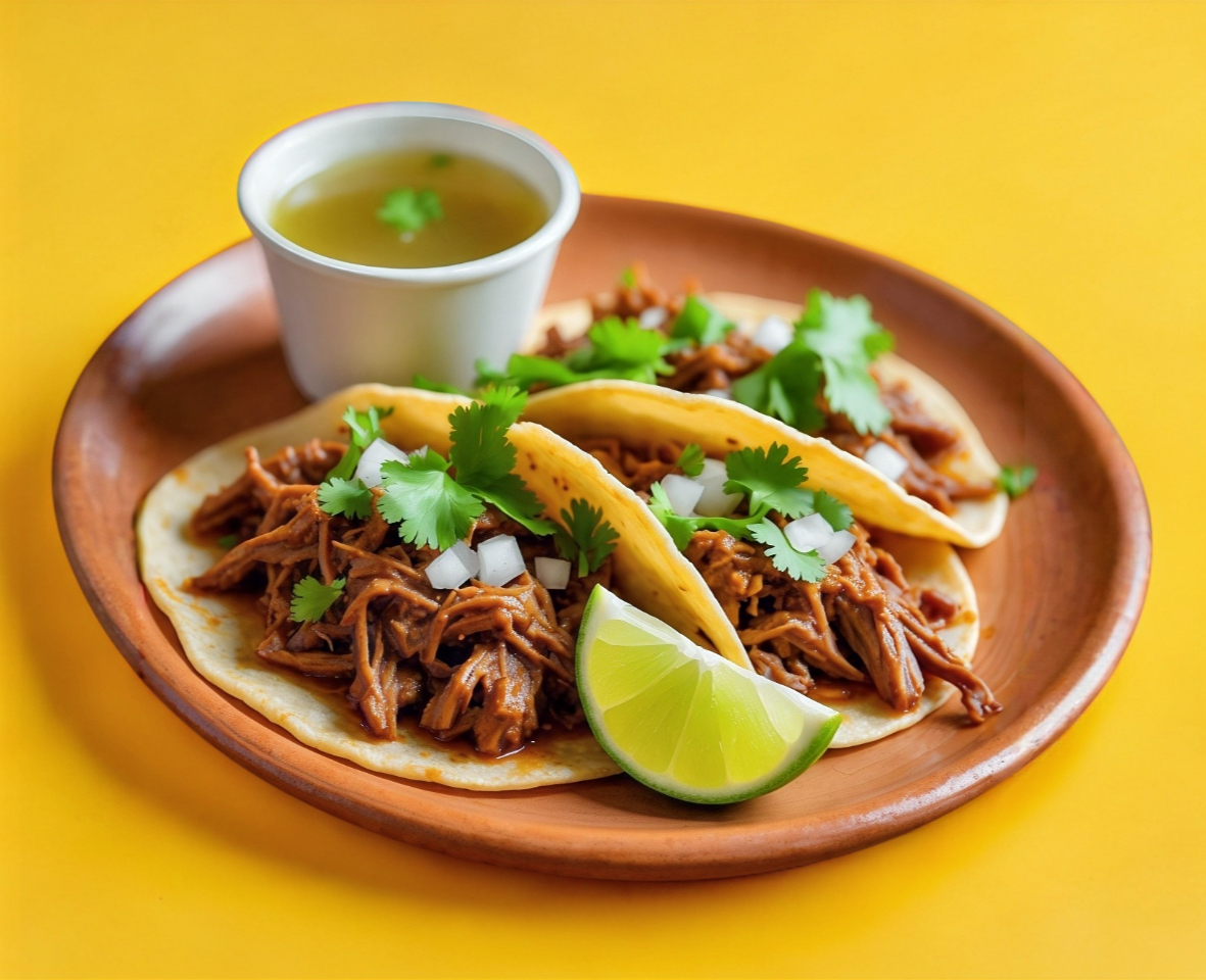 Tortilla de maíz con birria acompañada de cilantro, cebolla y limón
