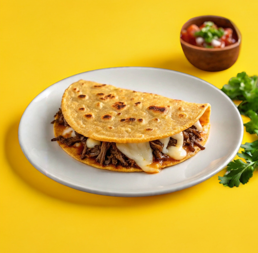 Tortilla de maiz torteada a mano rellena de carne de birria y queso. Acompañada de cebolla, cilantro, limón, salsa verde.