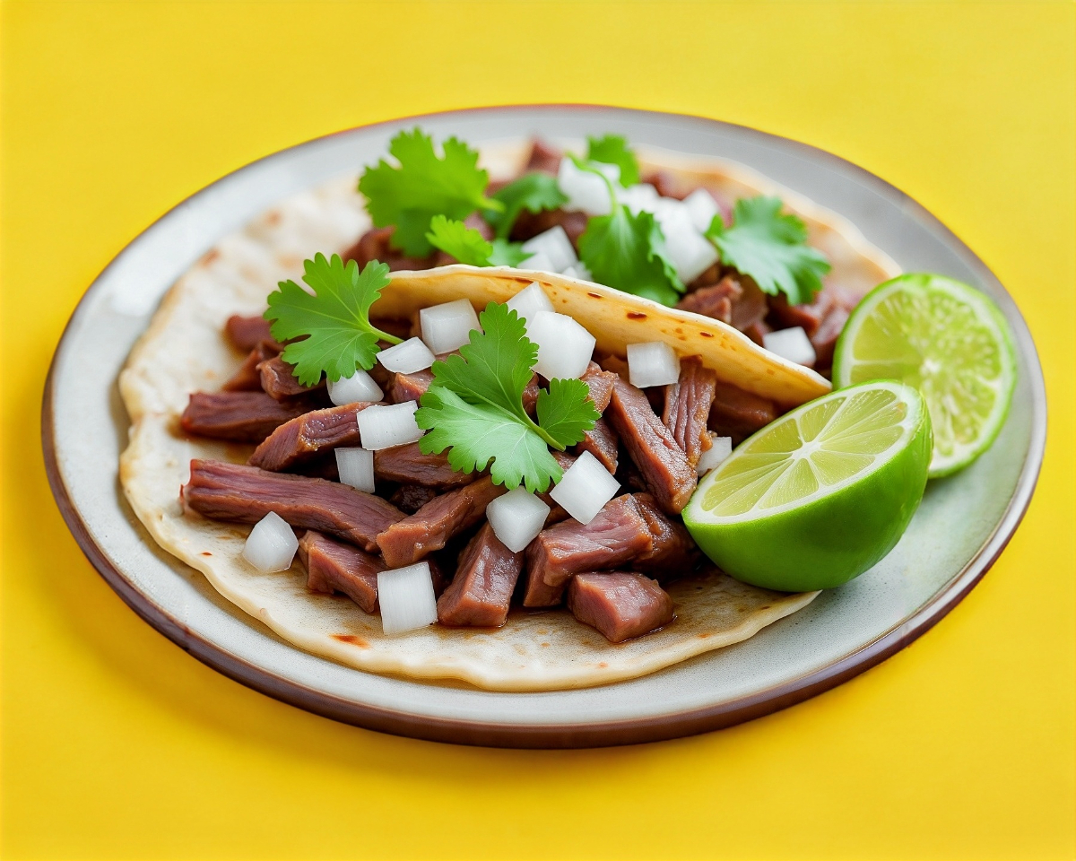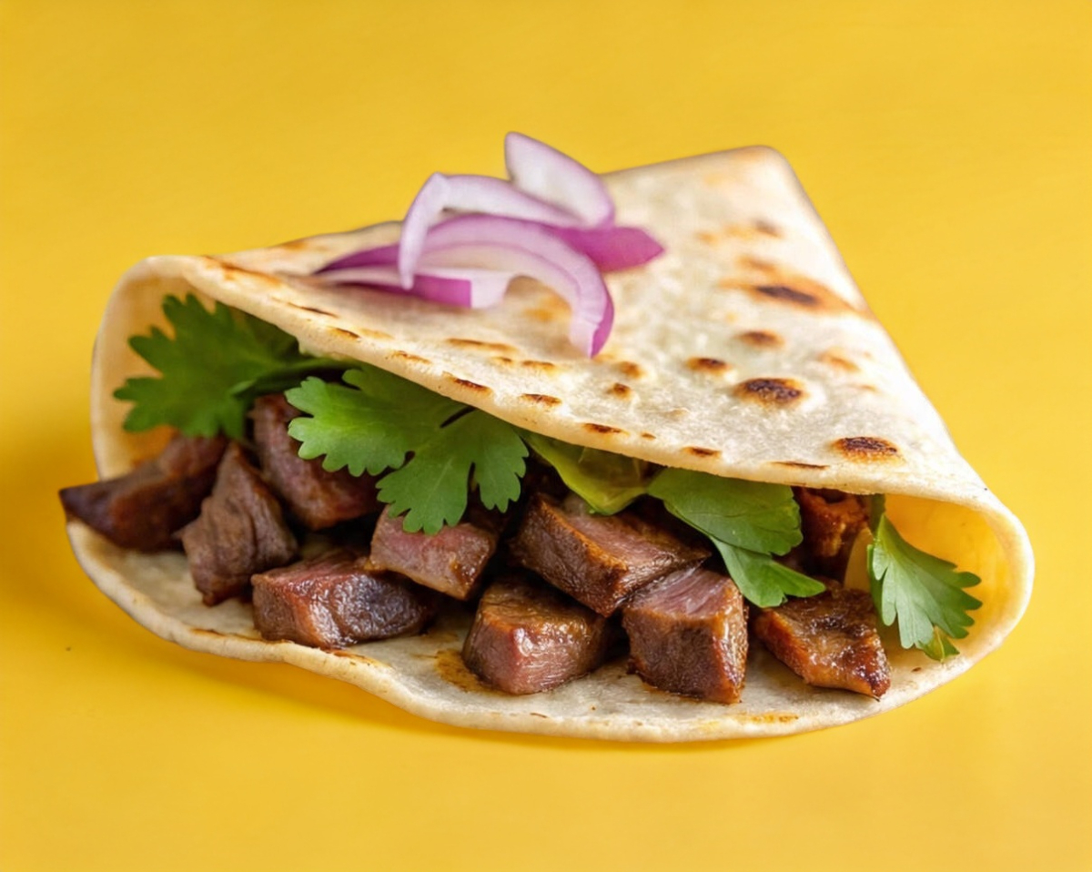 tortilla de maíz con jugosa carne de arrachera acompañada de cilantro, cebolla y limón.