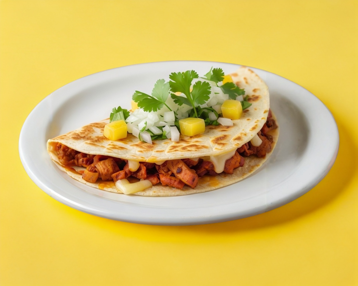 Tortilla de harina rellena de carne de cerdo estilo pastor con queso