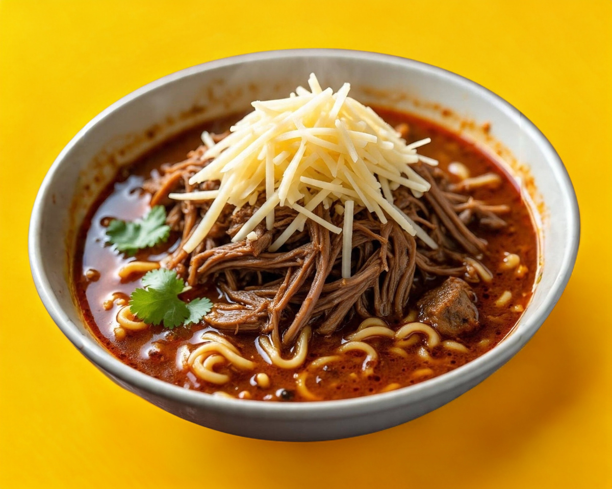 Consome de birria, con 100 gr de carne deshebrada de res, ramen y queso. Acompañada de cilantro, cebolla y cilantro.