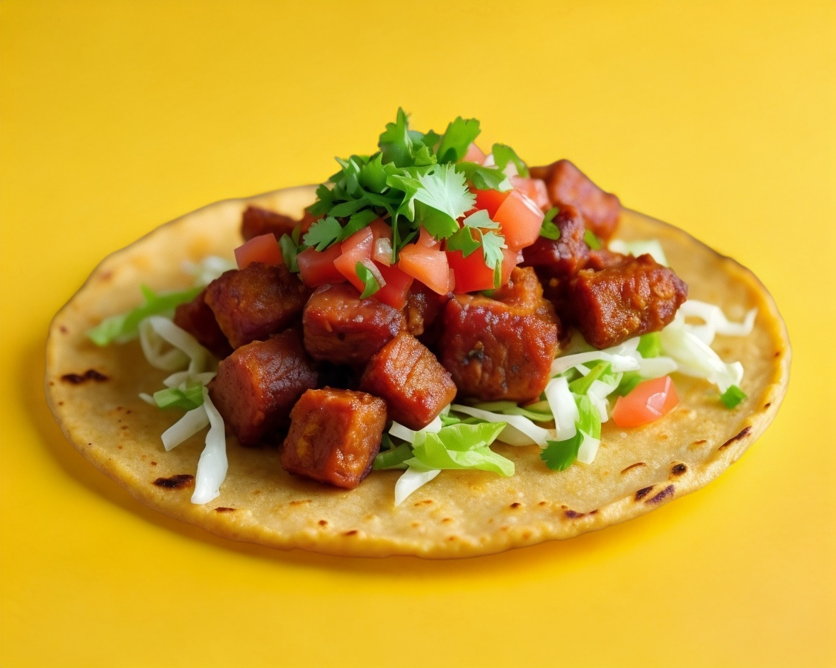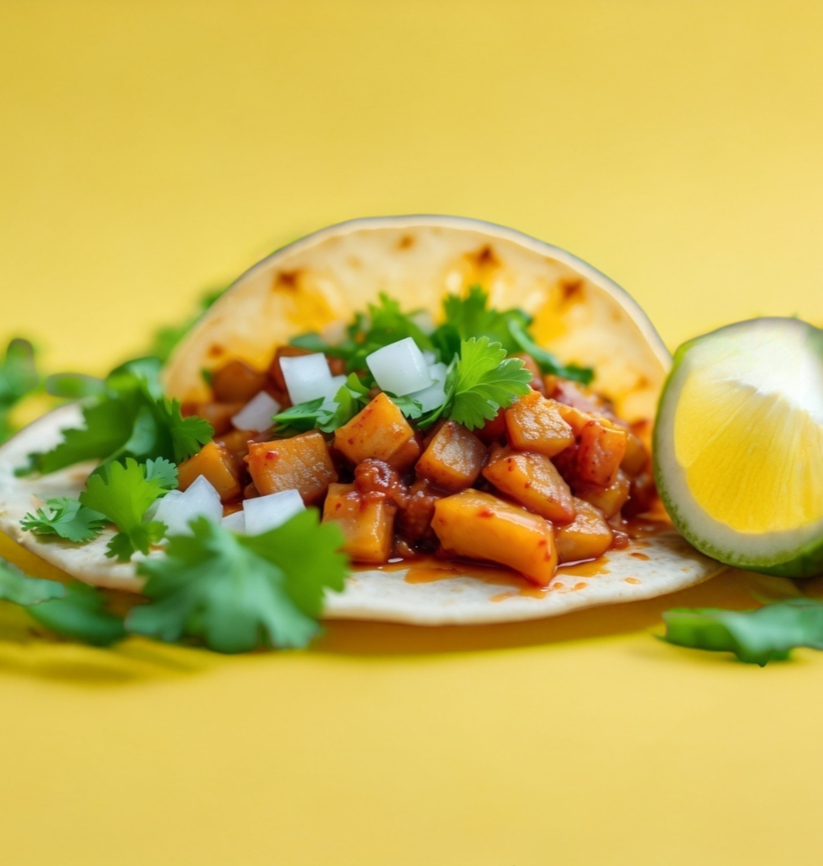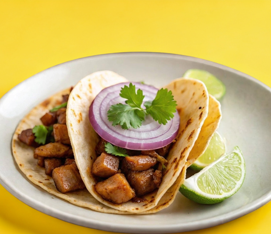 Tortilla de maíz con carne de cerdo estilo pastor acompañada de cilantro, cdbolla y limón.
