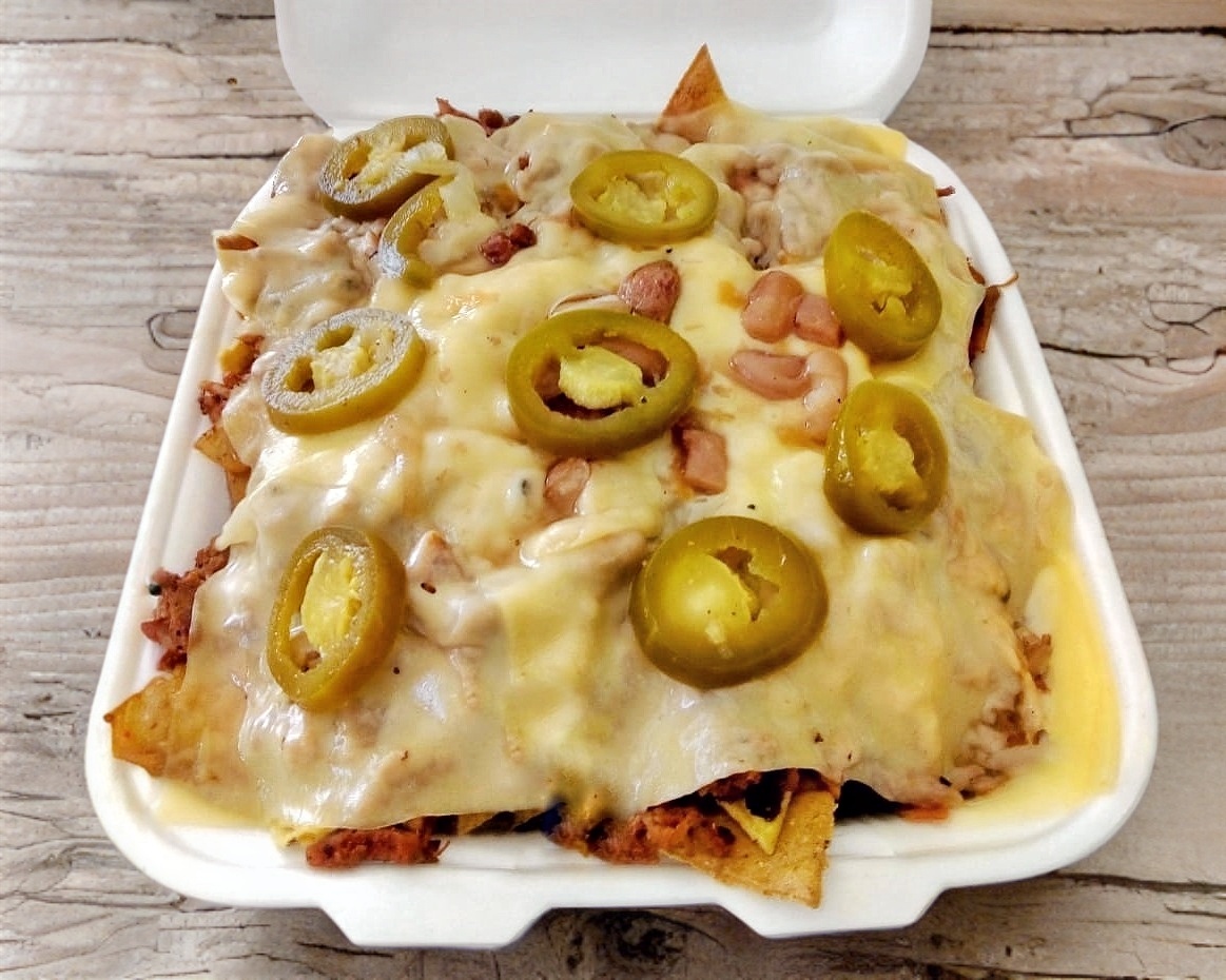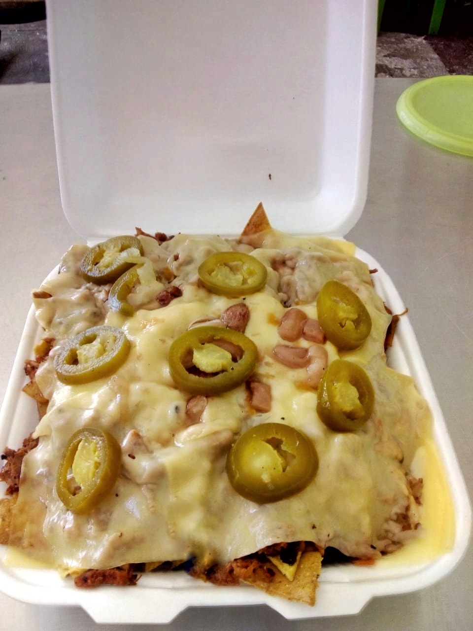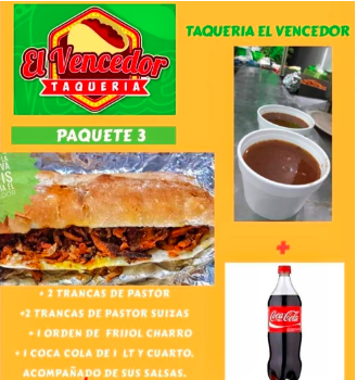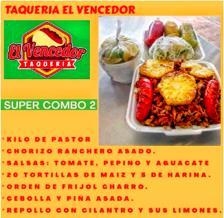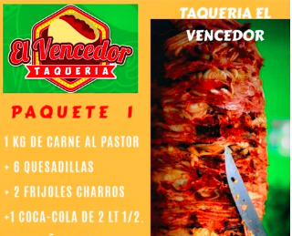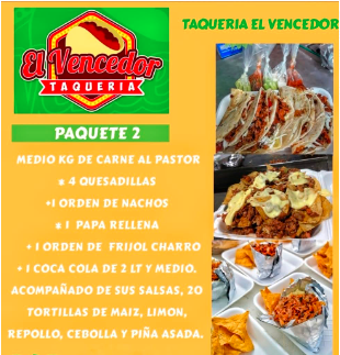 1/2 kg. de carne al pastor, 4 quesadillas, 1 orden de nachos, 1 papa rellena, 1 orden de frijol charro, 1 coca cola de 2.5 L., acompañado de sus salsas, 20 tortillas de maíz, limón, repollo, cebolla y piña asada.