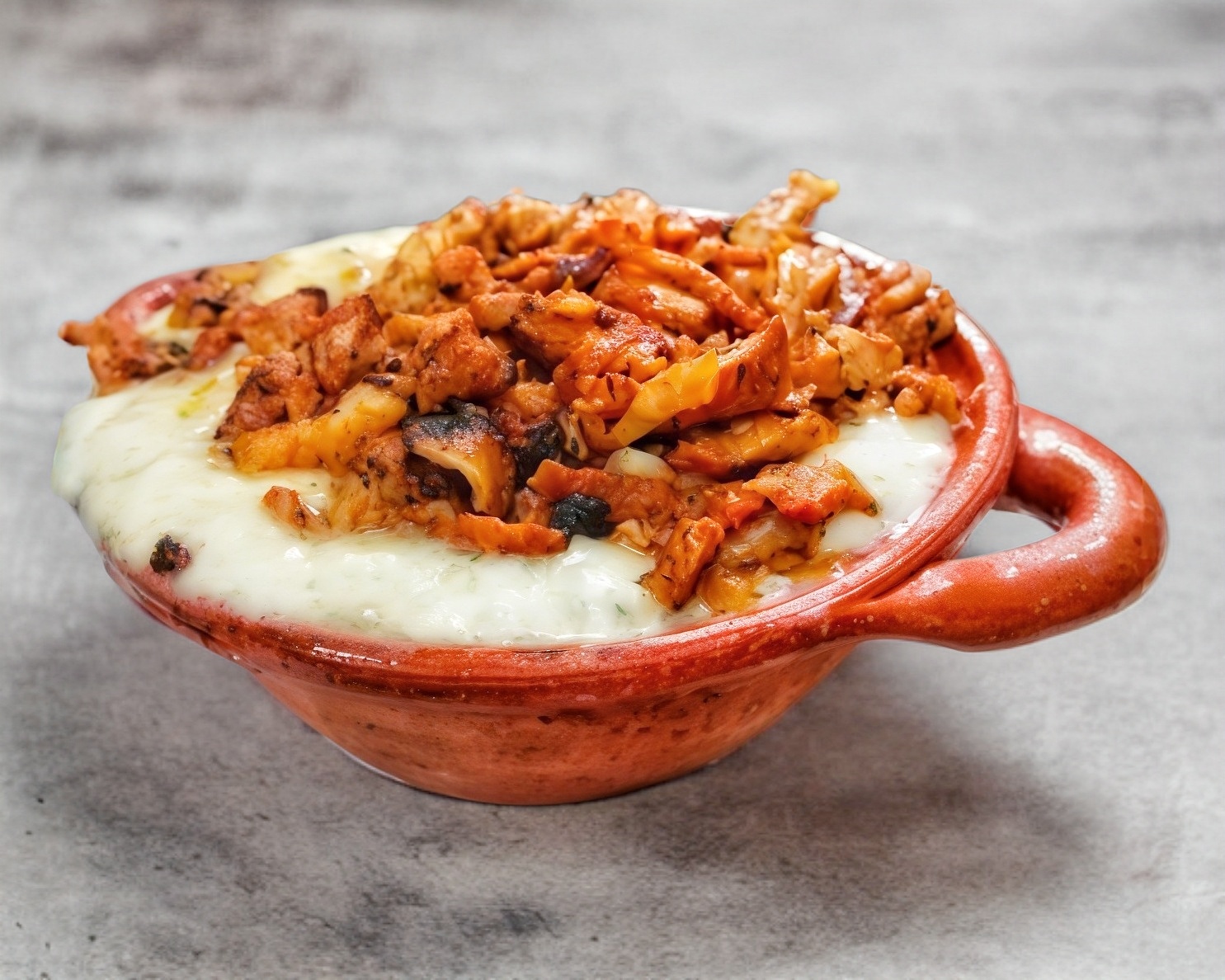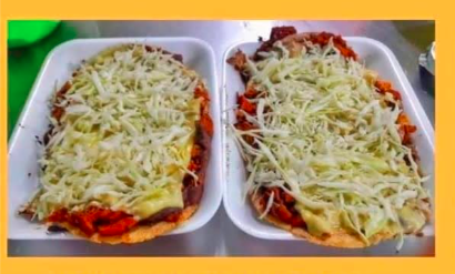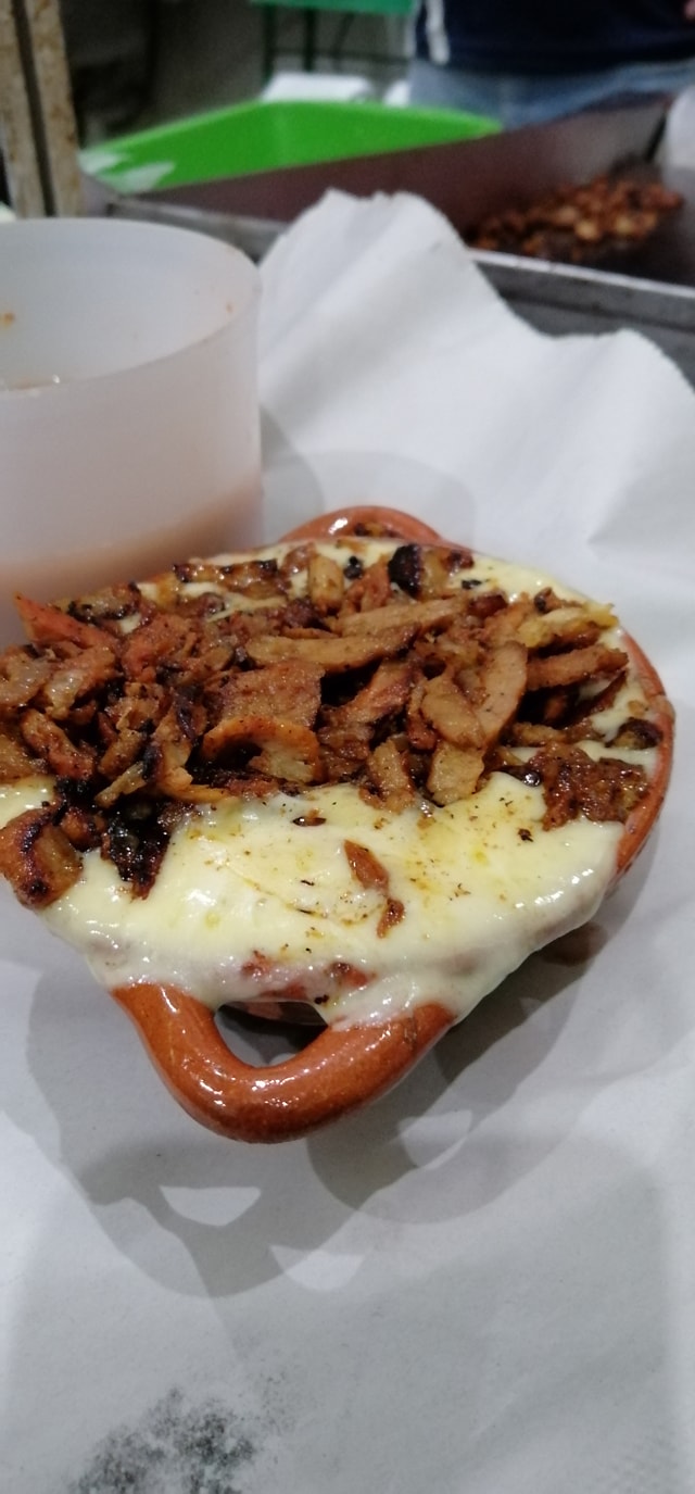 Masa acompañada con frijoles, pastor, queso, repollo, media crema y salsas