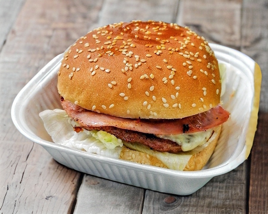 Carne, tocino, jamón, queso, lechuga, tomate y cebolla