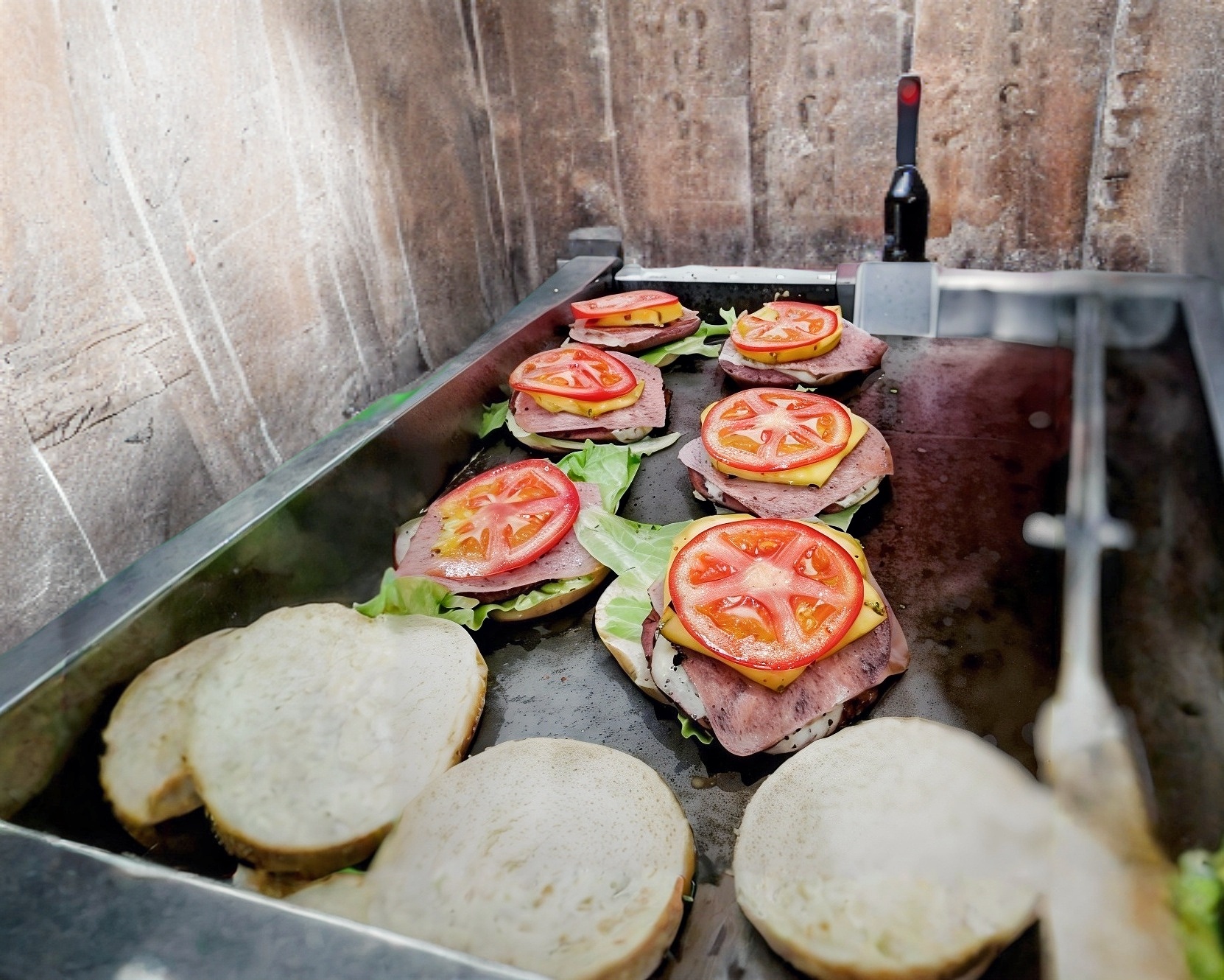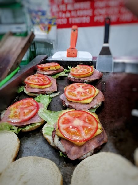 Carne, jamón, queso, salchicha, tocino, lechuga, tomate y cebolla