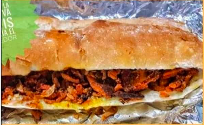 Carne, jamón, queso, chorizo asado, tocino, jalapeño, lechuga, tomate y cebolla.