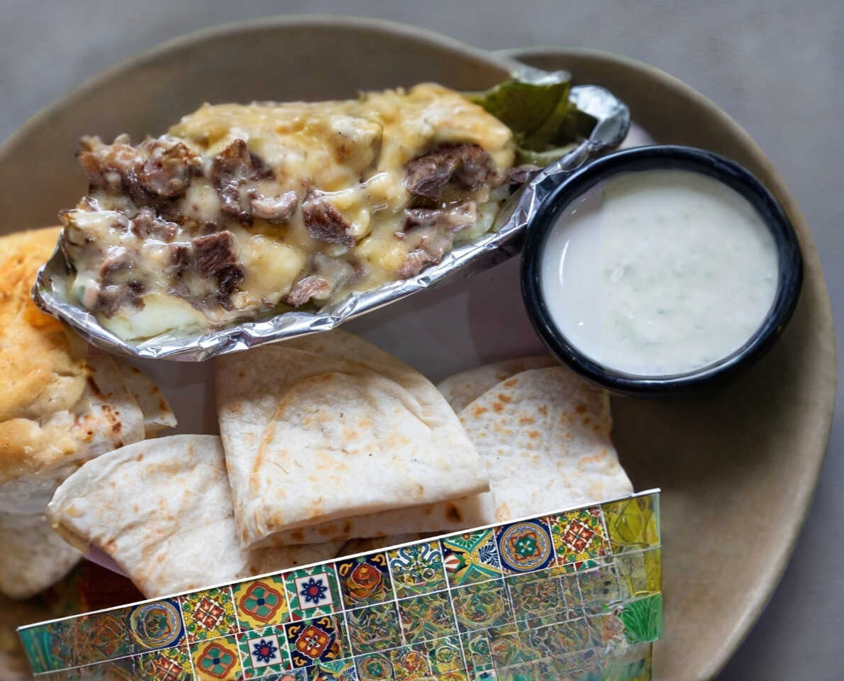 Gringa con tortilla de harina, queso derretido y carne de arrachera.