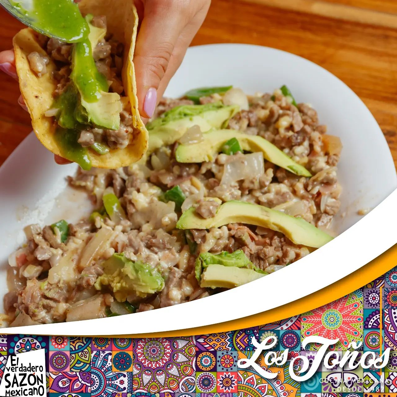 Taco con tortilla a elegir, cabeza, cebolla, cilantro y picante.