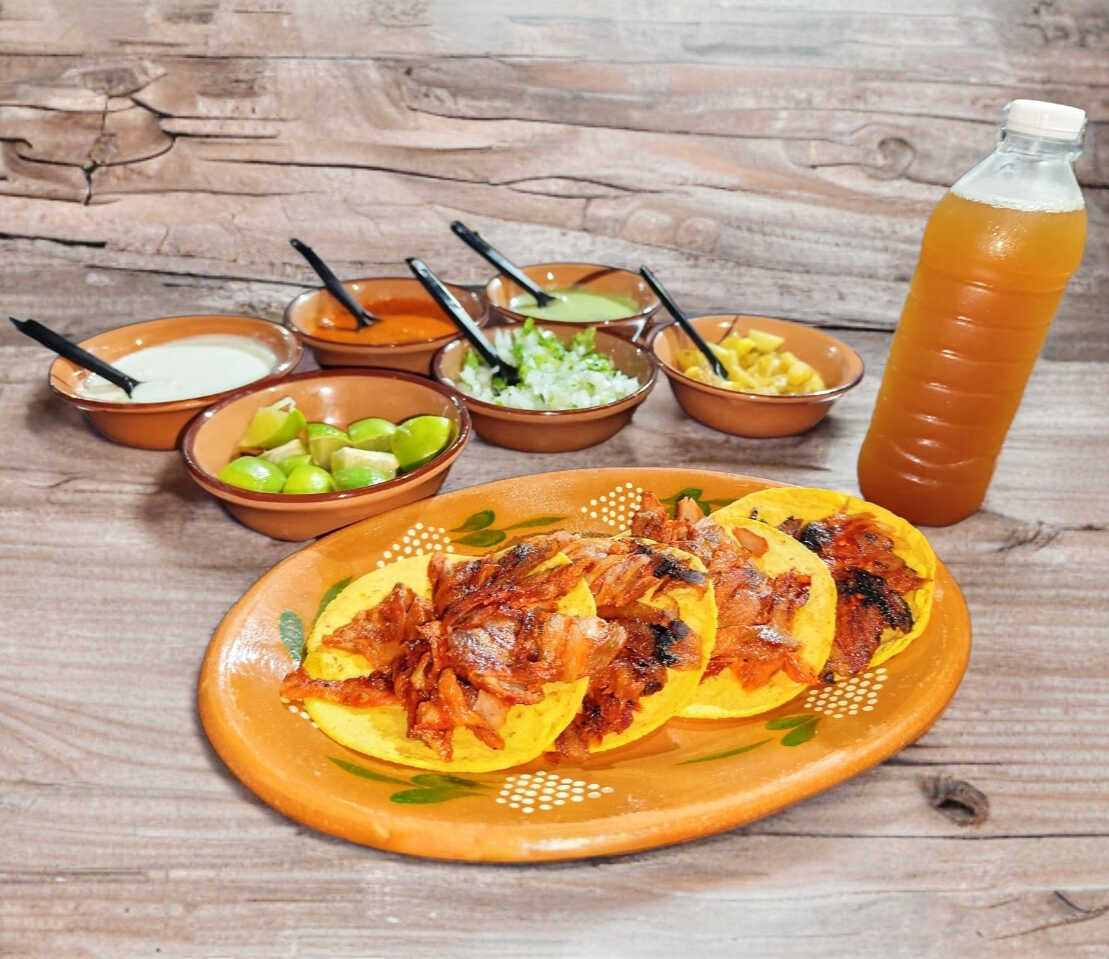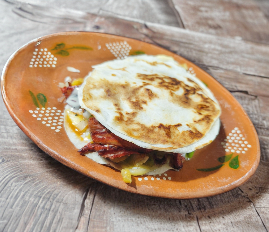 Doble tortilla de maíz hecha a mano, queso y carne a elegir.