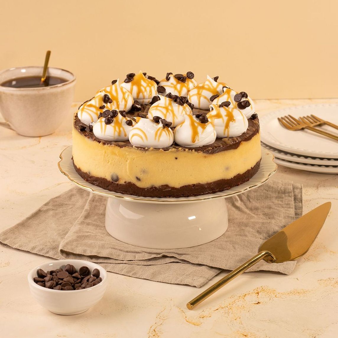 Exquisito cheesecake con doble chocolate y cremoso cacahuate decorado con caramelo y chispas de chocolate oscuro. De 10 a 12 porciones.