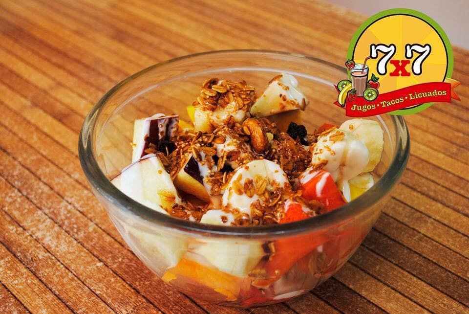 Papaya, melón, sandía, piña, manzana y plátano, incluye miel, granola y yogurt.