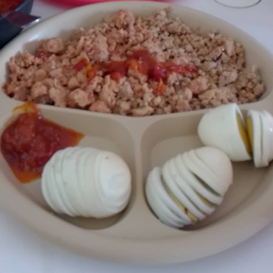 Plato con porción de guiso mixto (carne molida más lomitos) y tortillas.