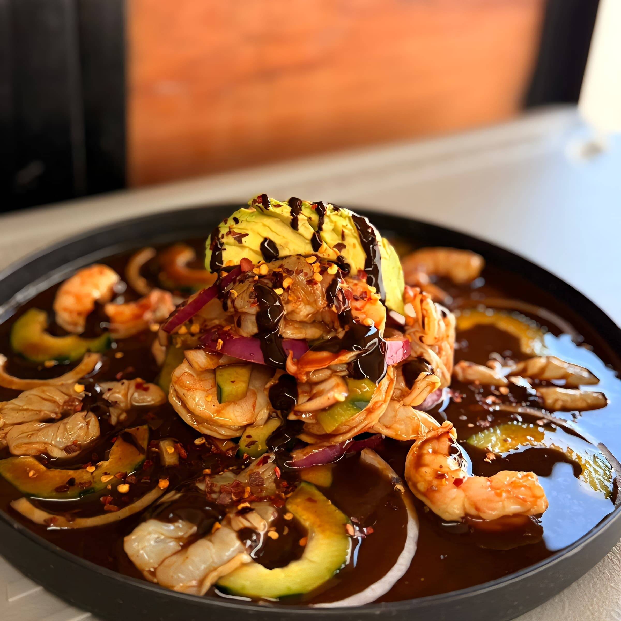 Camaron curtido fresco, en nuestra deliciosa salsa negra de la casa, preparado con jugo natural de limon, pepino, y cebolla morada