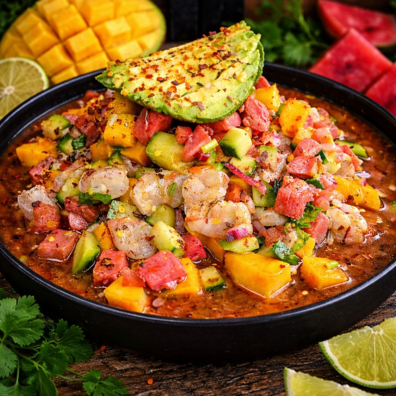 Ceviche de Atún con camarón curtido, mango, jitomate, cebolla, cilantro, pepino y salsas negras