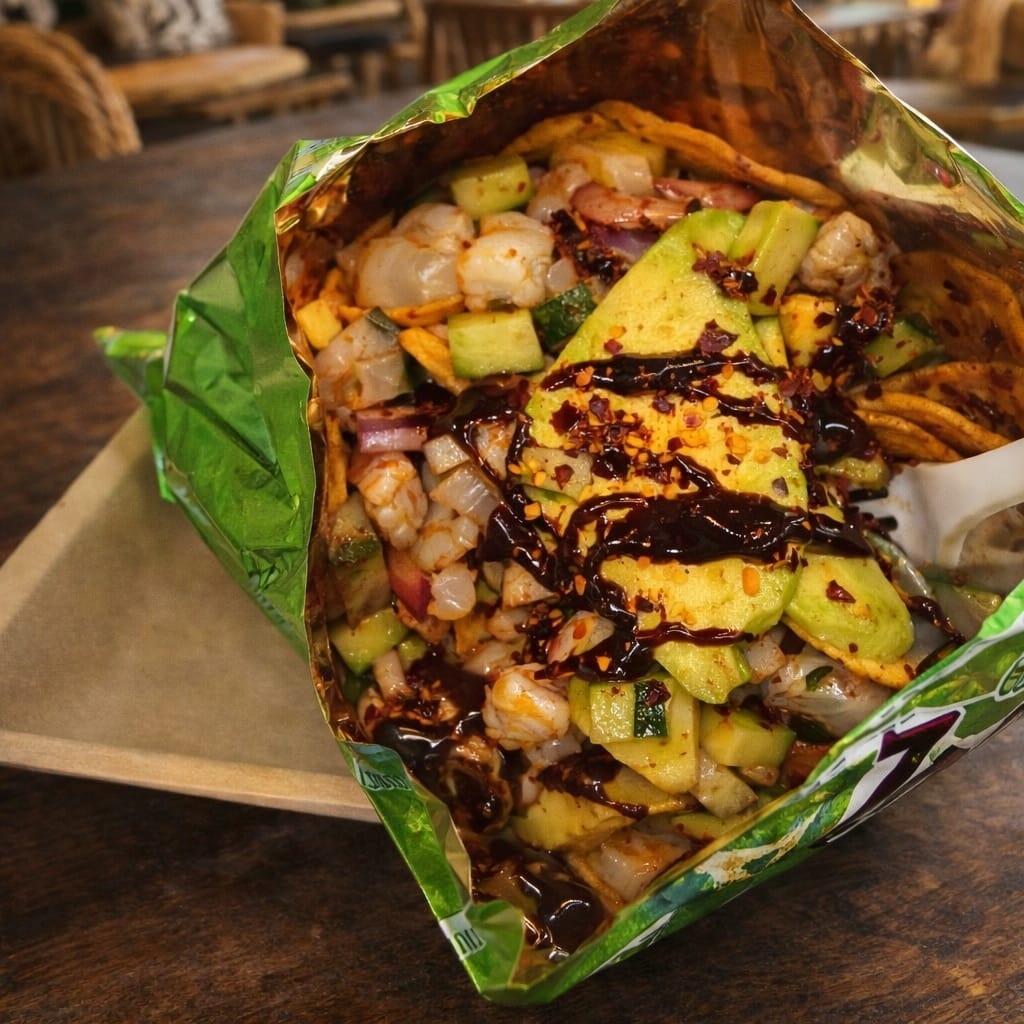 Deliciosos tostitos servidos con media orden de nuestro increíble aguachile negro
