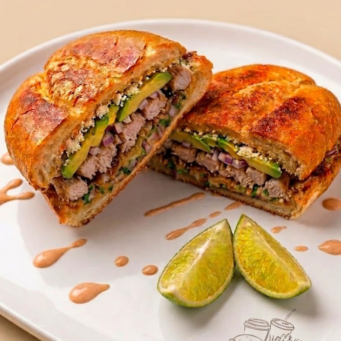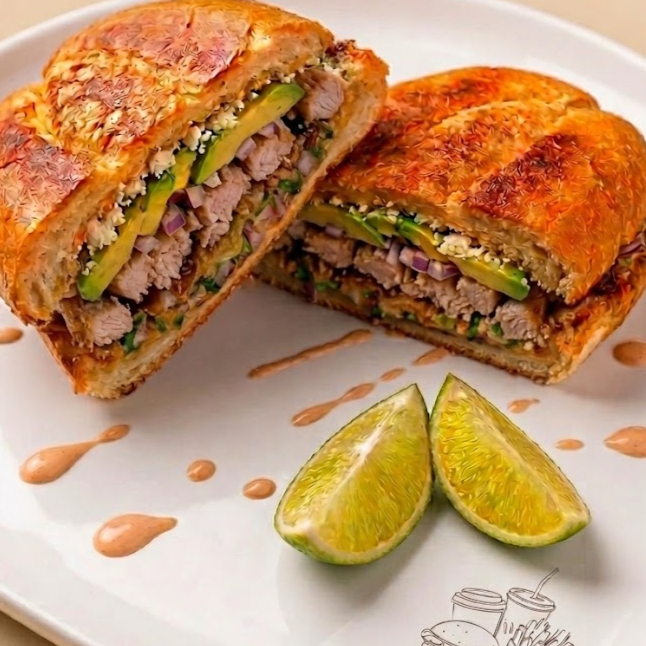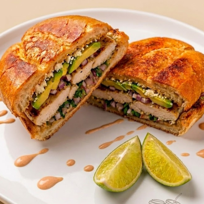 Pan frijol, POLLO Y QUESO, lechuga, tomate, aguacate