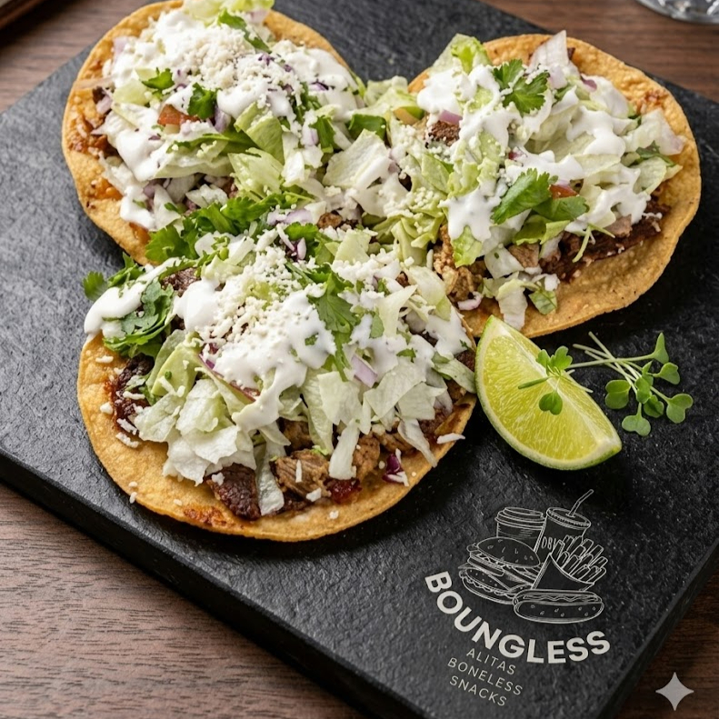 3PZ de tostadas, carne de chuleta, lechuga, tomate, frijol, crema y cebolla