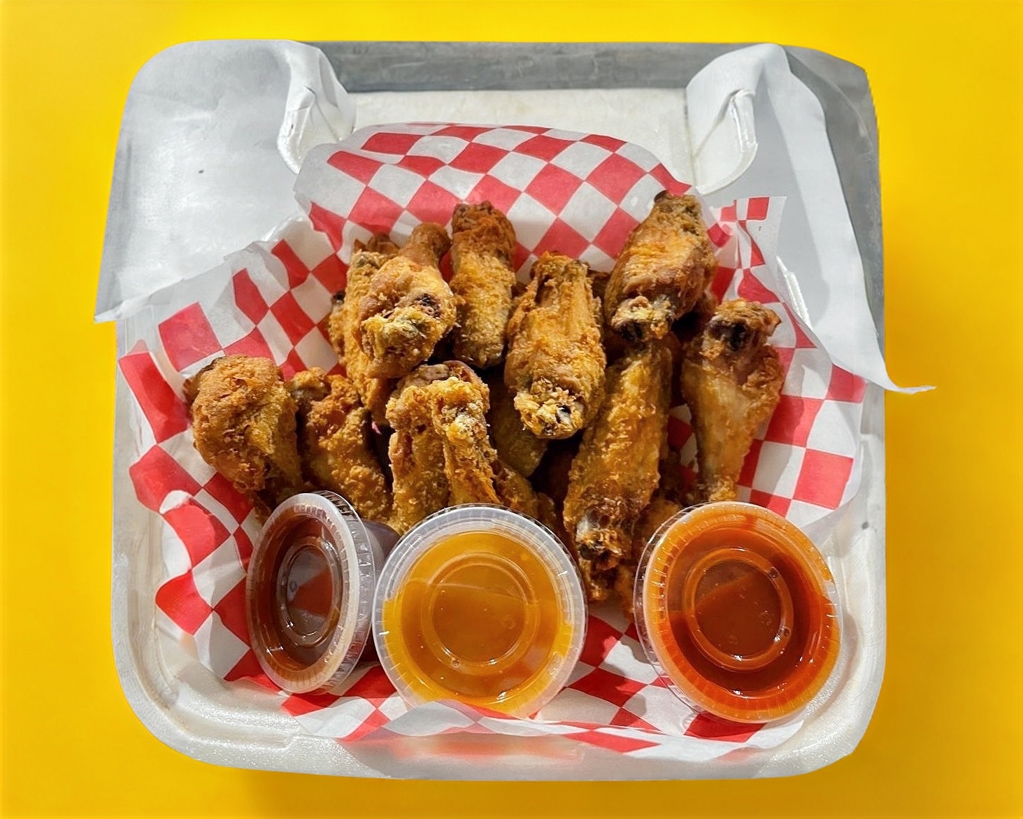 24 Piezas de alitas con elección de 3 salsas al gusto.