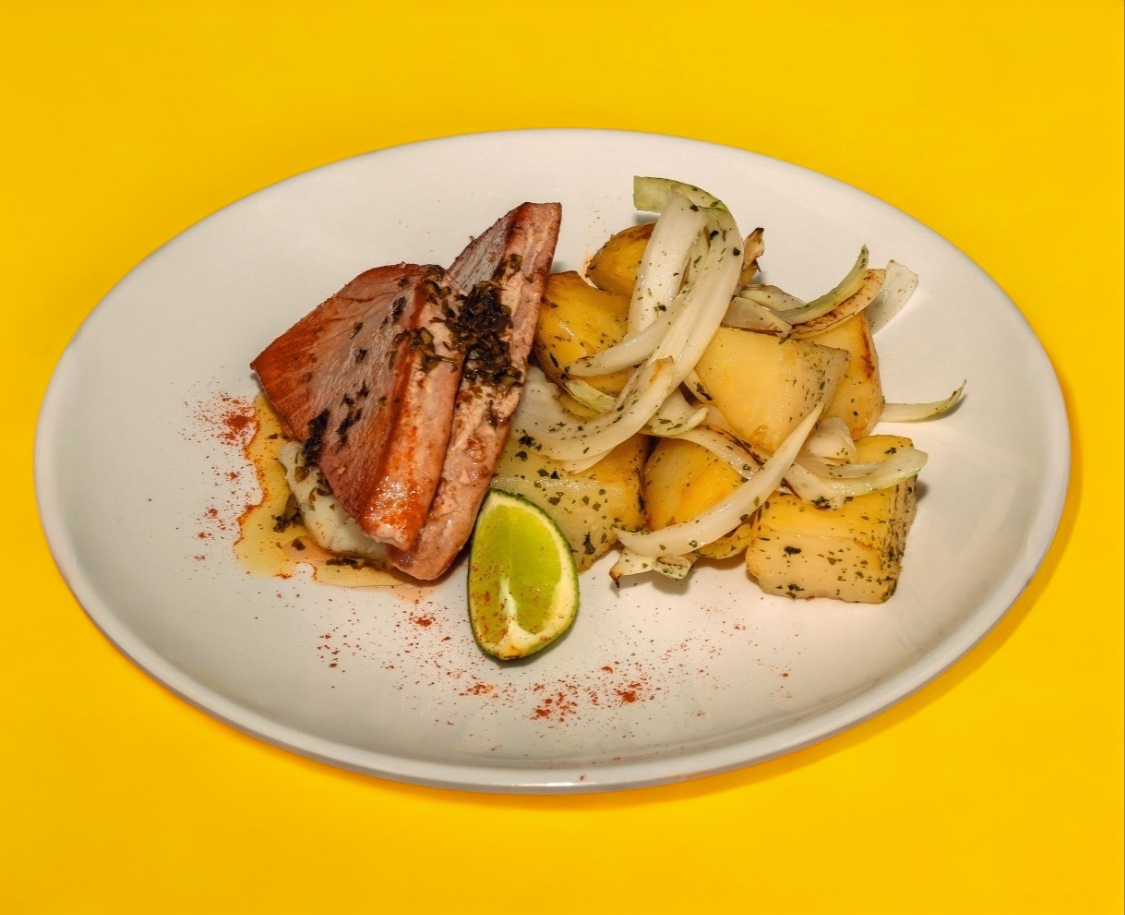 medallon de atun de aleta amarilla de 150 g acompañada de papas y cebollas