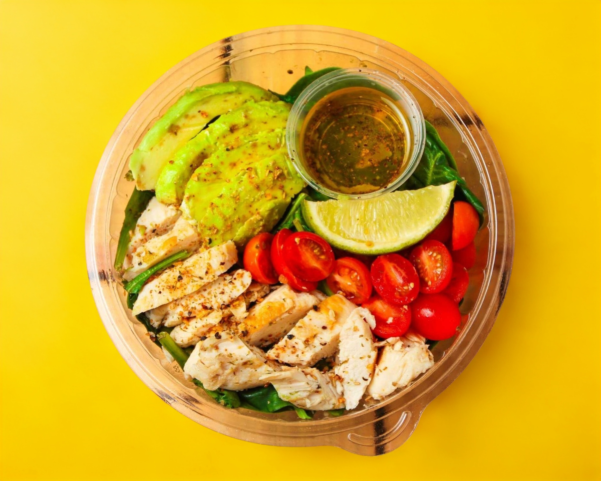 espinaca aguacate tomate cherry pollo rostizado 120 gms vinagre balsamico y aceite de oliva