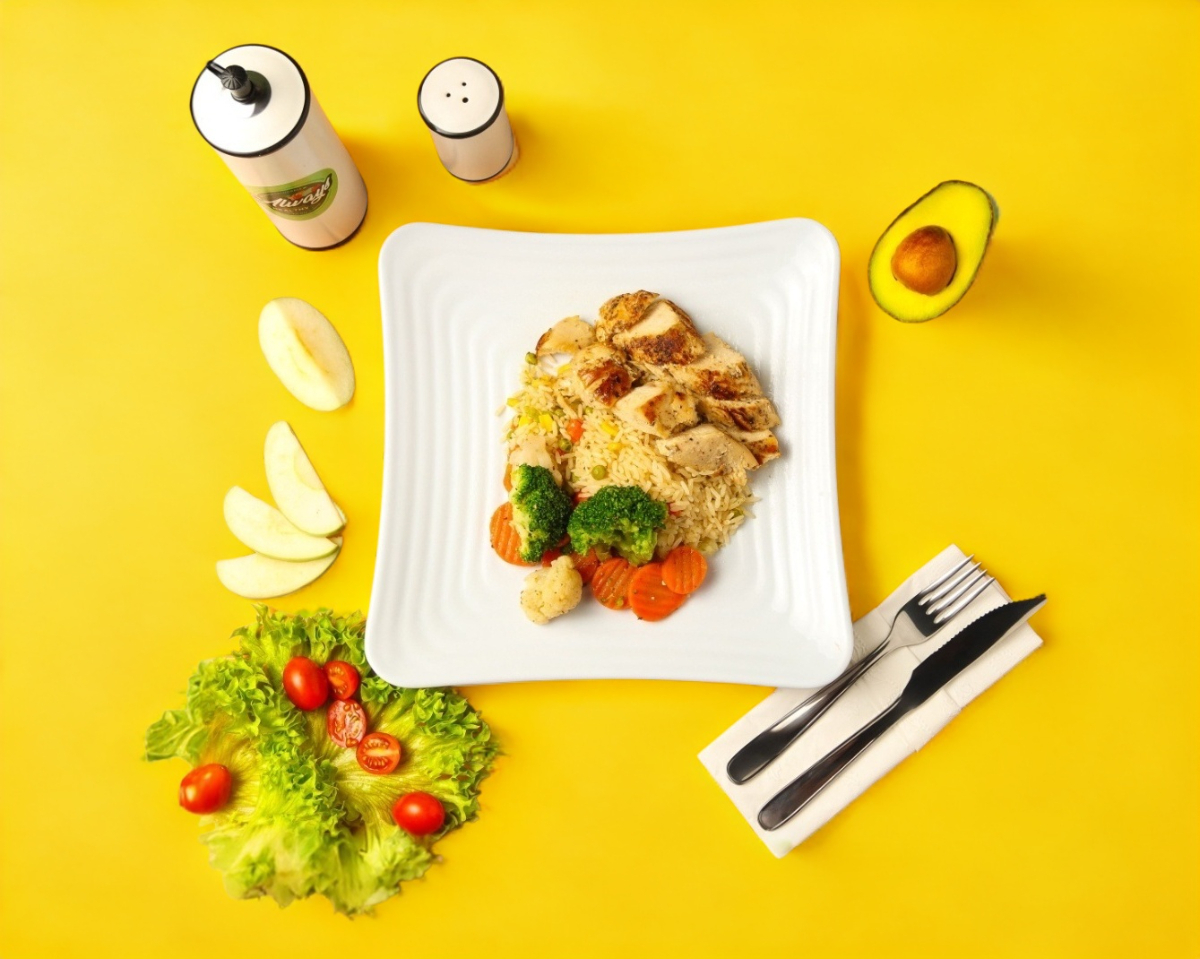 Platillo personal ;Pechuga de pollo a la plancha acompañada de arroz integral con guisantes y vegetales al vapor