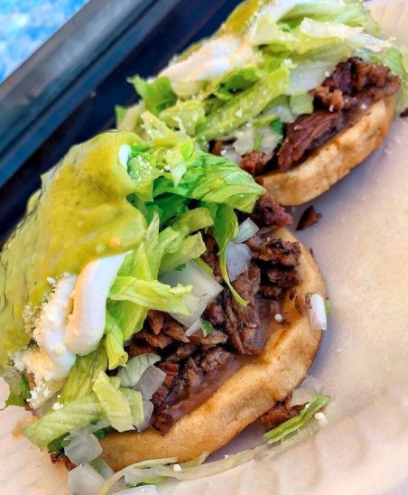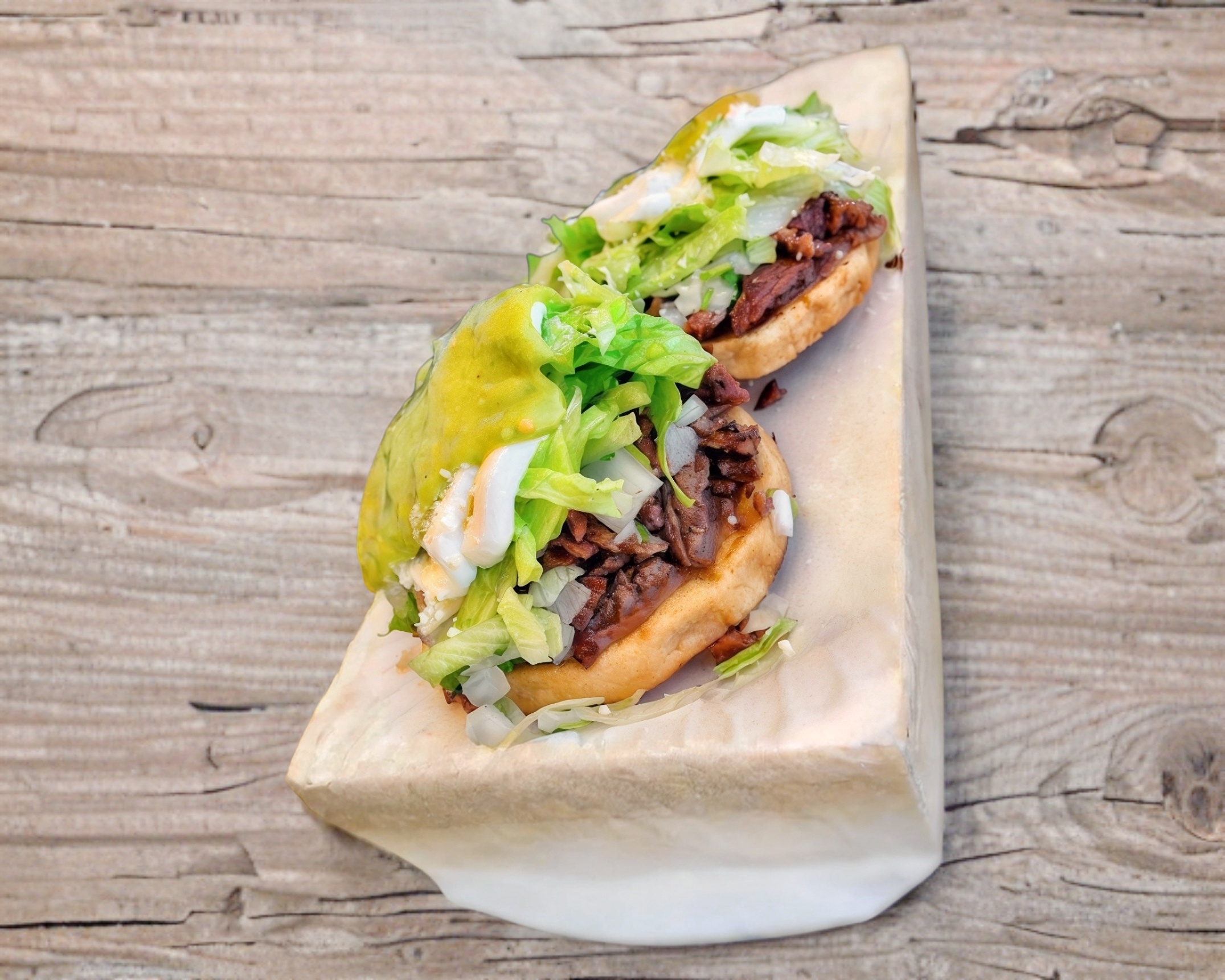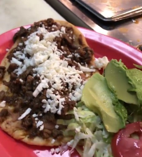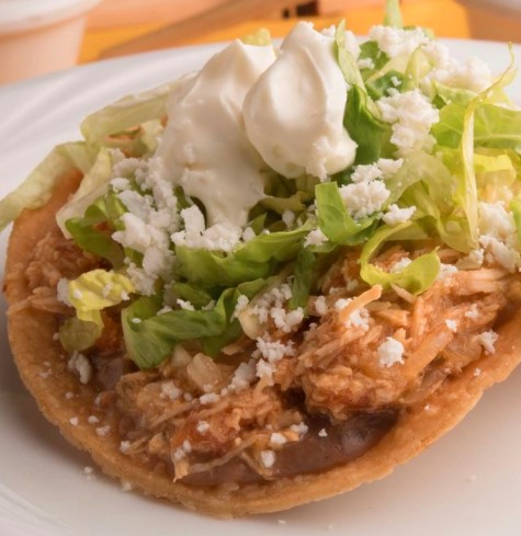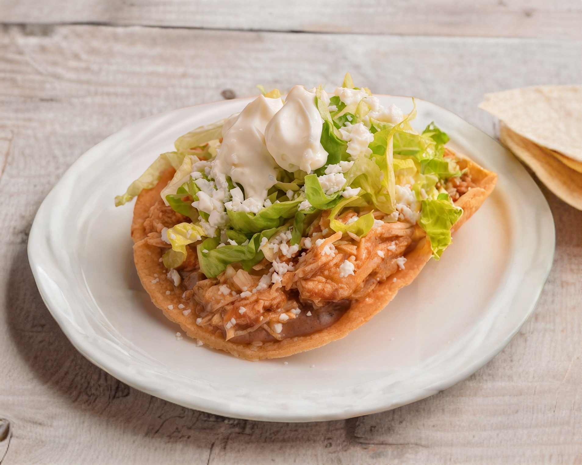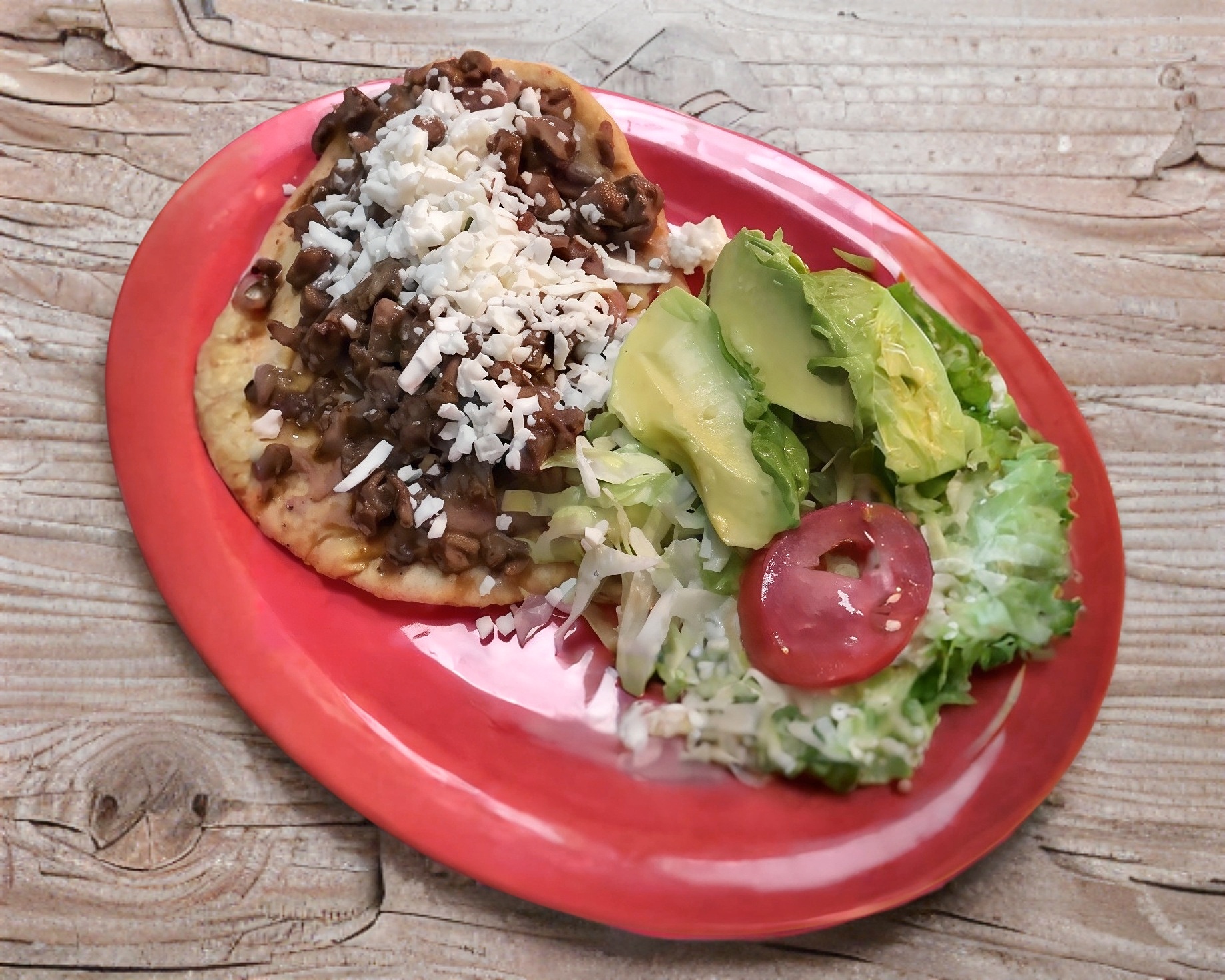 Servido con frijol refrito, lechuga, crema y queso fresco.