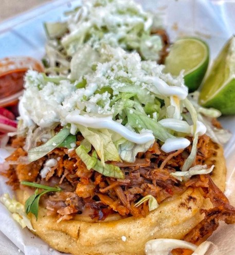 Elaborado con carne de cerdo, servido con cebolla, orégano, limón y chile molido.