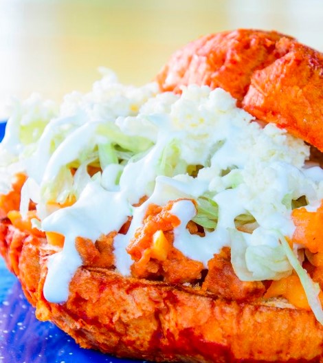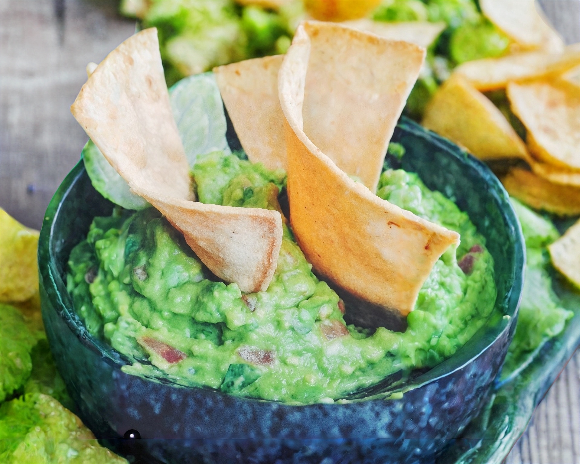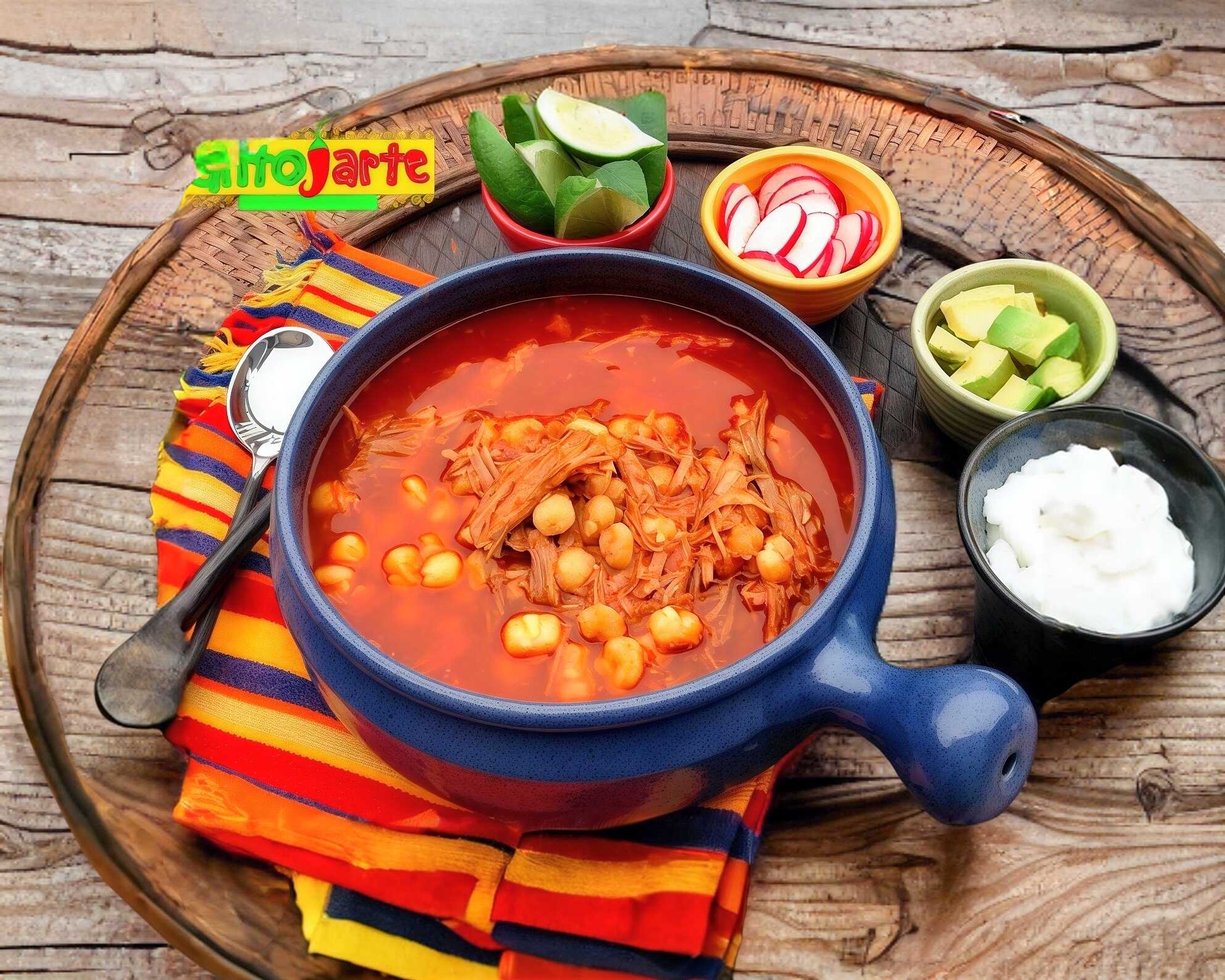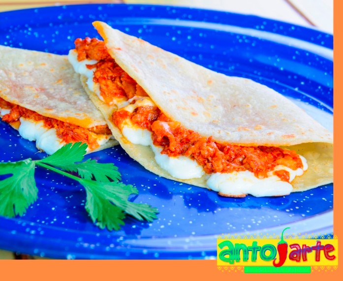 Con queso panela, aguacate, chicharrón, crema y chile pasilla.