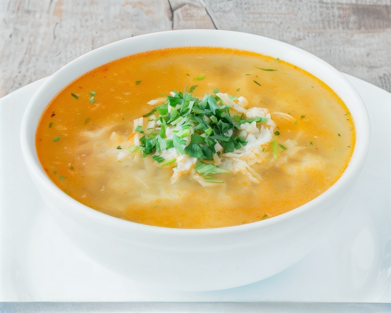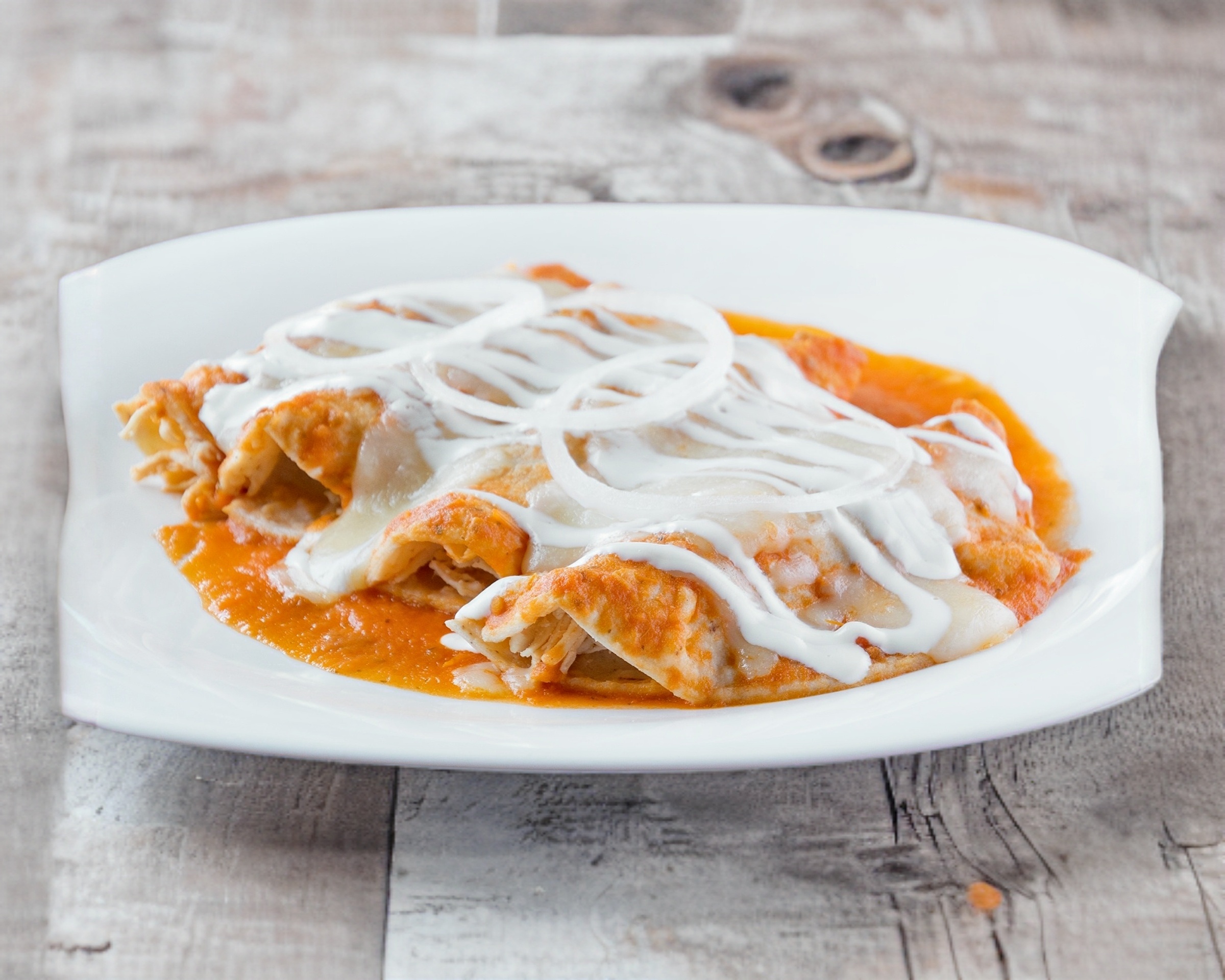 Tres tortillas ligeramente fritas, rellenas de pollo, bañadas en salsa de frijol con crema, queso fresco y aros de cebolla.